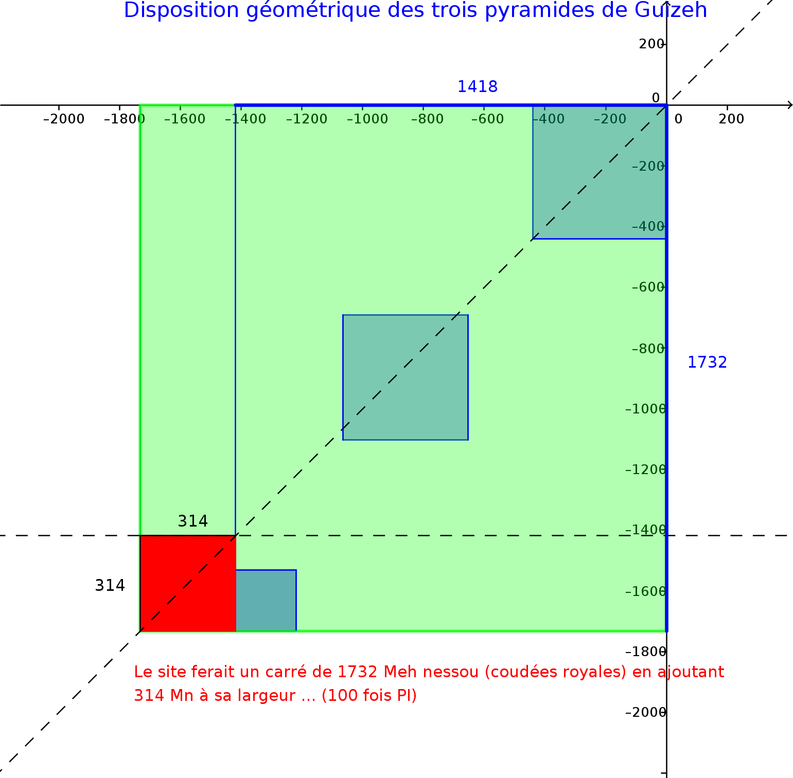 Mais si on aborde le fait que c'est bien un carré de 1000 donnant 1414 et 1732, il faut accepter qu'il y a une erreur de prise sur le terrain de notre part, selon la déduction des relevés, ajouter aux imprécisions inévitables des arpenteurs Égyptiens, quoique cela m'étonnerait vu leur exceptionnelle maîtrise.