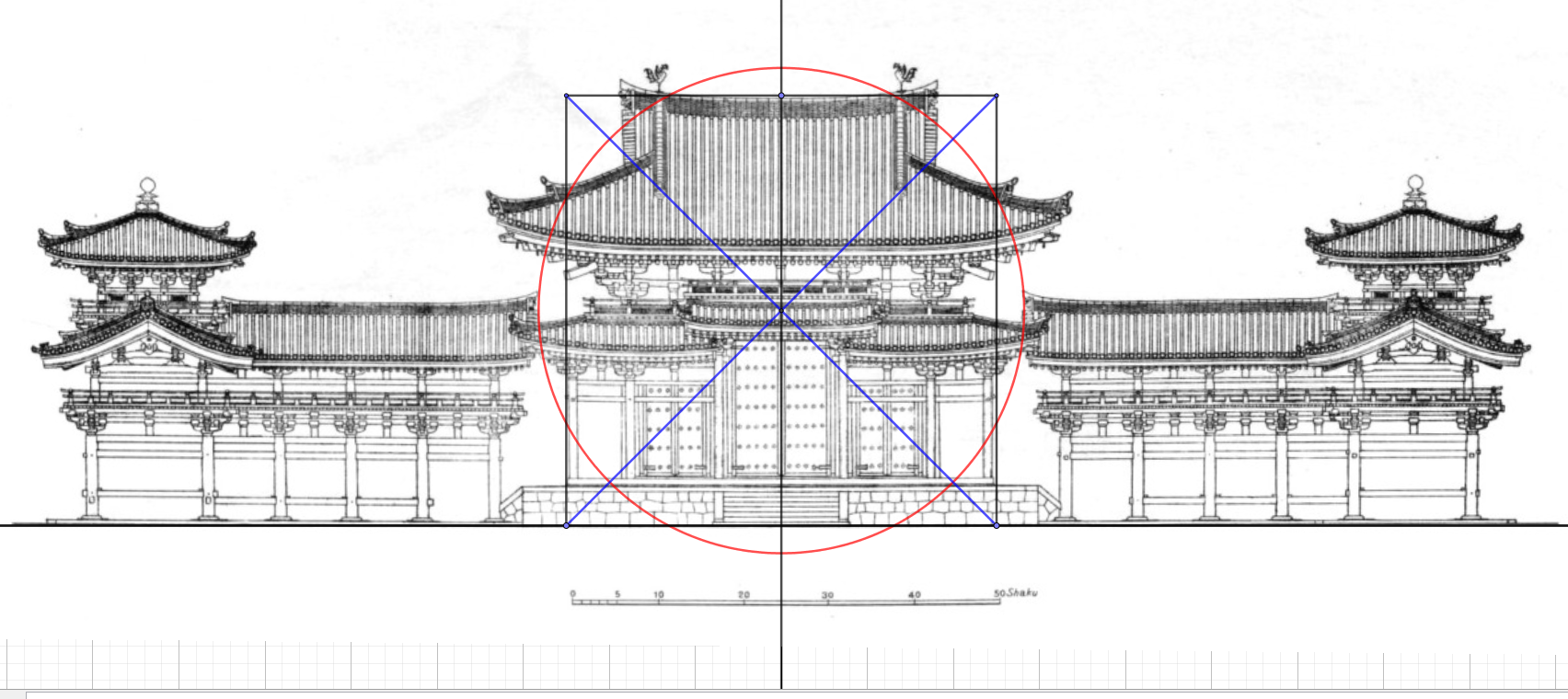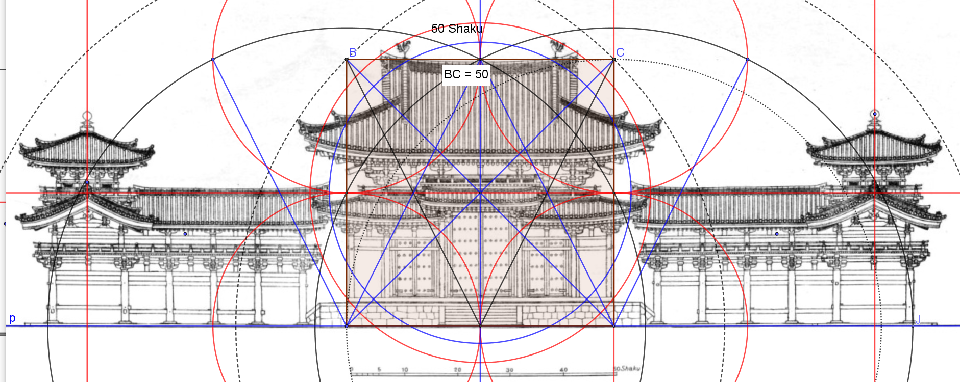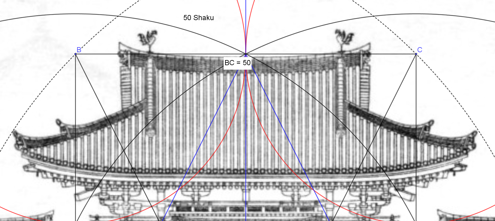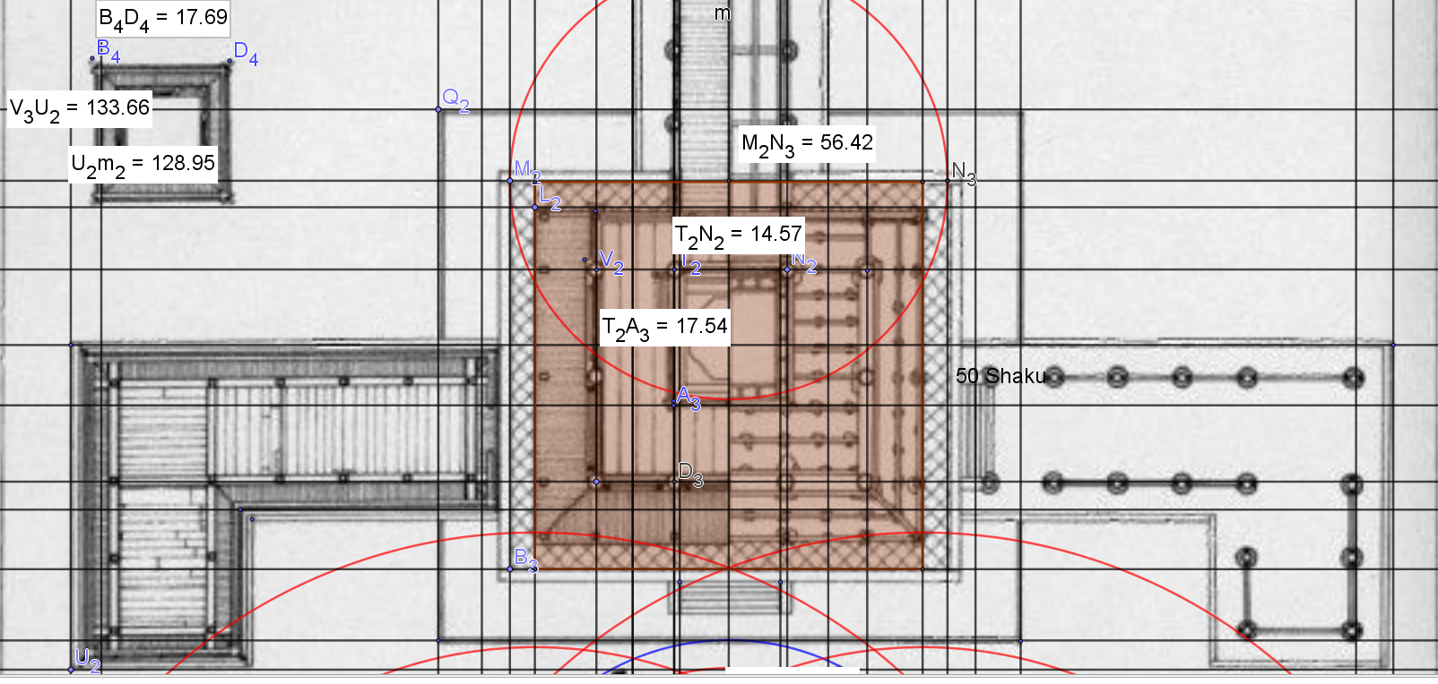 l'espace totale avec le socle, 168.67 Shaku est la largeur totale et 132.527 Shaku la longueur, leur rapport est de 1.2727217 qui peut ĂŞtre un 4/pi ou un racine de Phi !