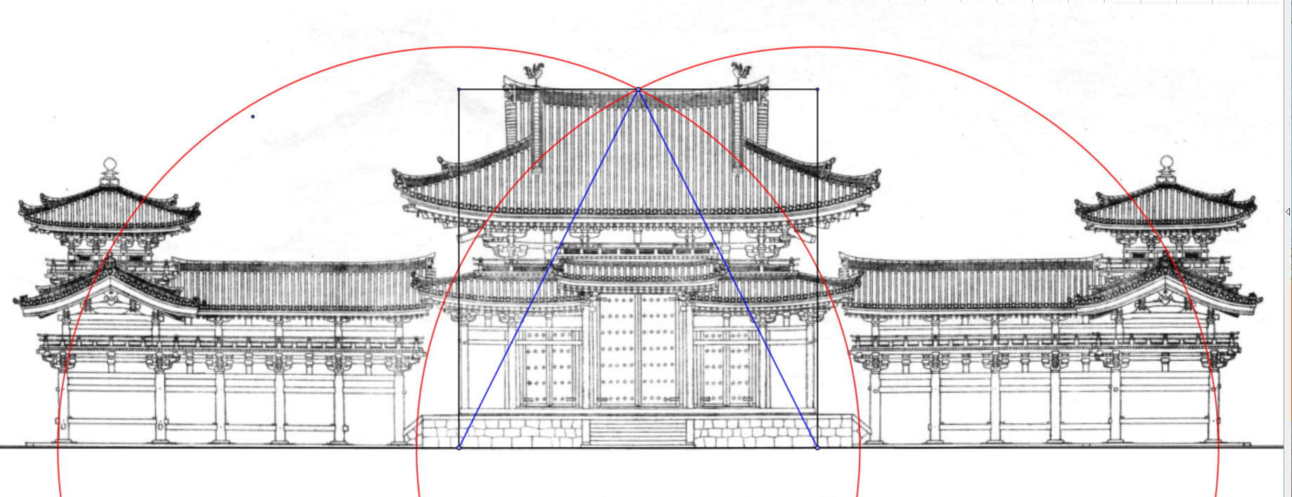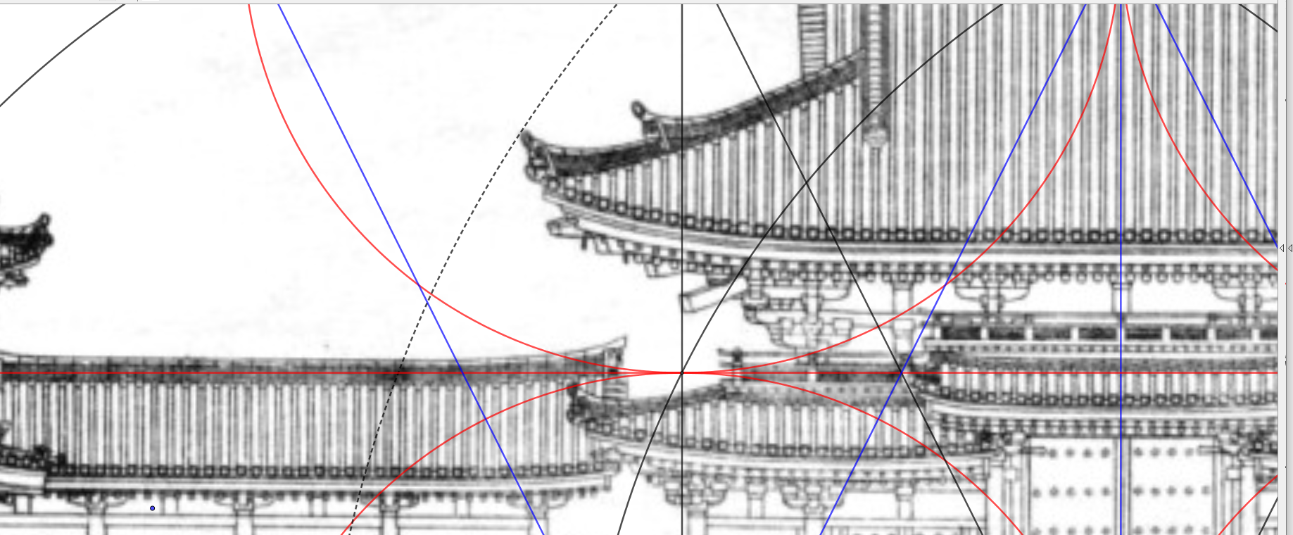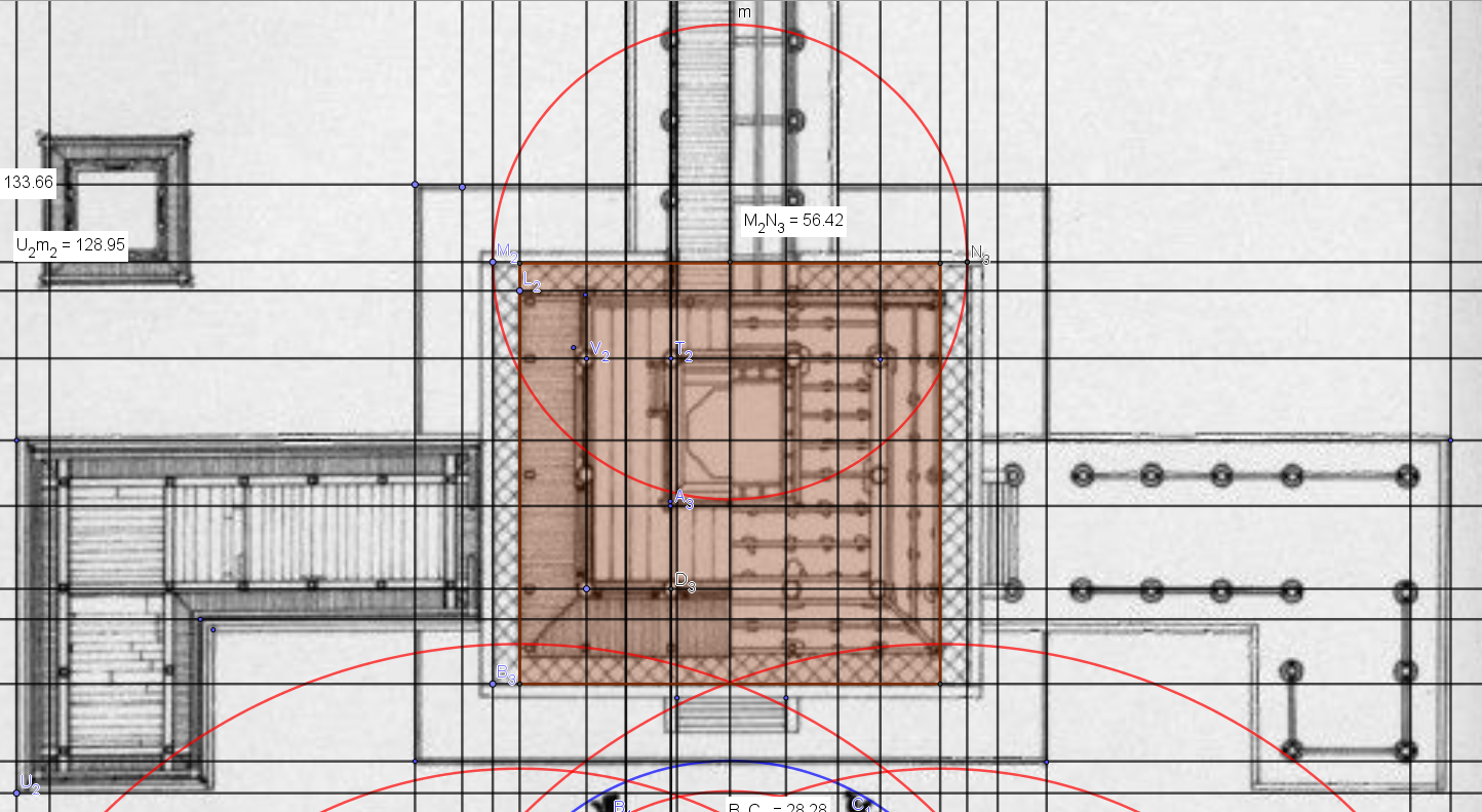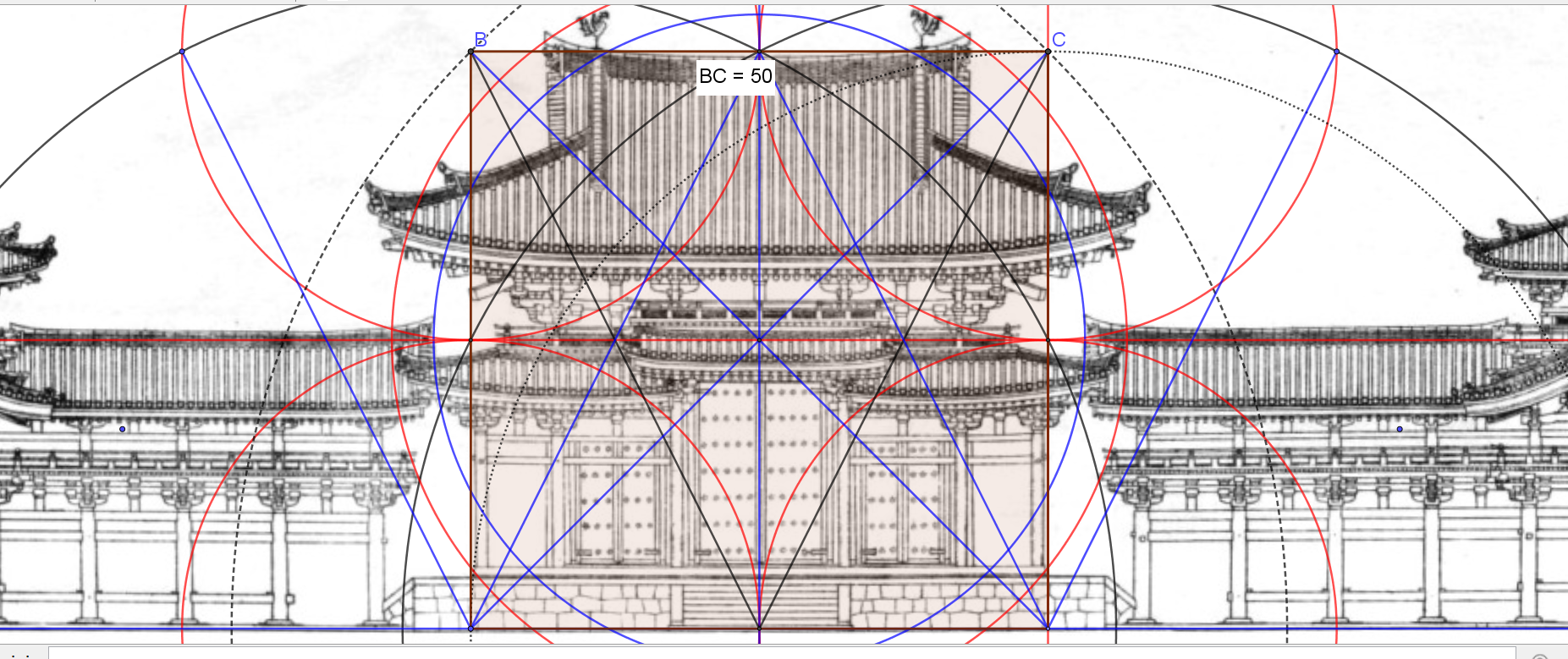 l'espace totale avec le socle, 168.67 Shaku est la largeur totale et 132.527 Shaku la longueur, leur rapport est de 1.2727217 qui peut ĂŞtre un 4/pi ou un racine de Phi !