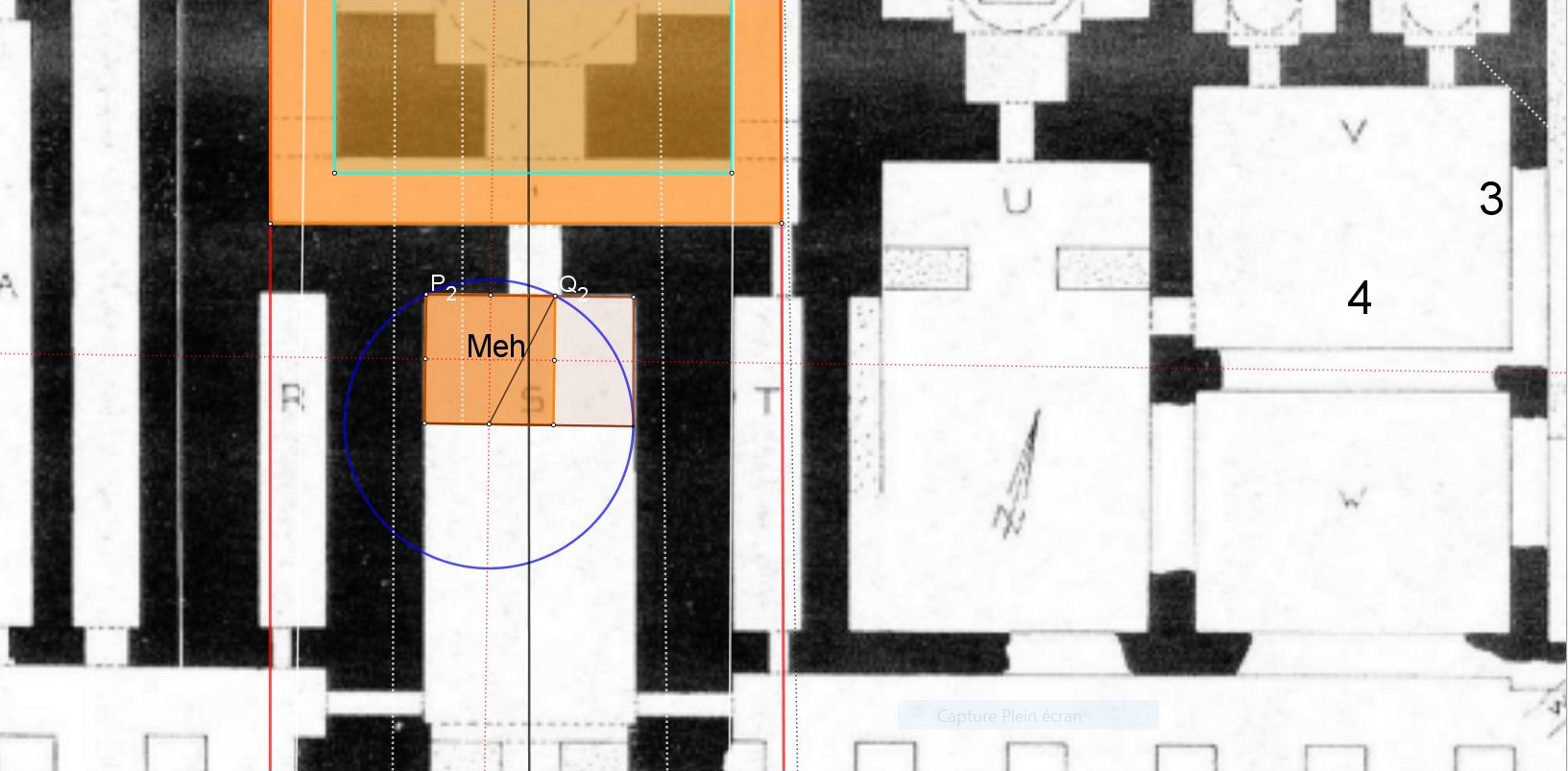 Le carré Meh n'apparait pas ici tout comme dans la petite Chapelle de Sésostris 1er à Karnak, mais commence par un carré de 6 meh nessou de côté, dont la diagonale devient la longueur totale de la Chapelle, ce qui correspond ici au côté du carré central.