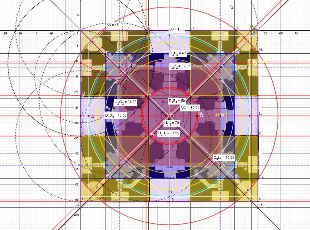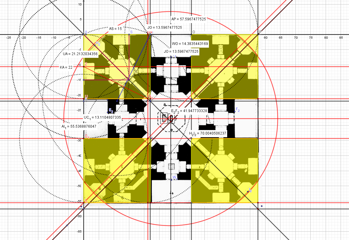 Le grand cercle rouge a même surface que le grand carré qui inscrit le sanctuaire.