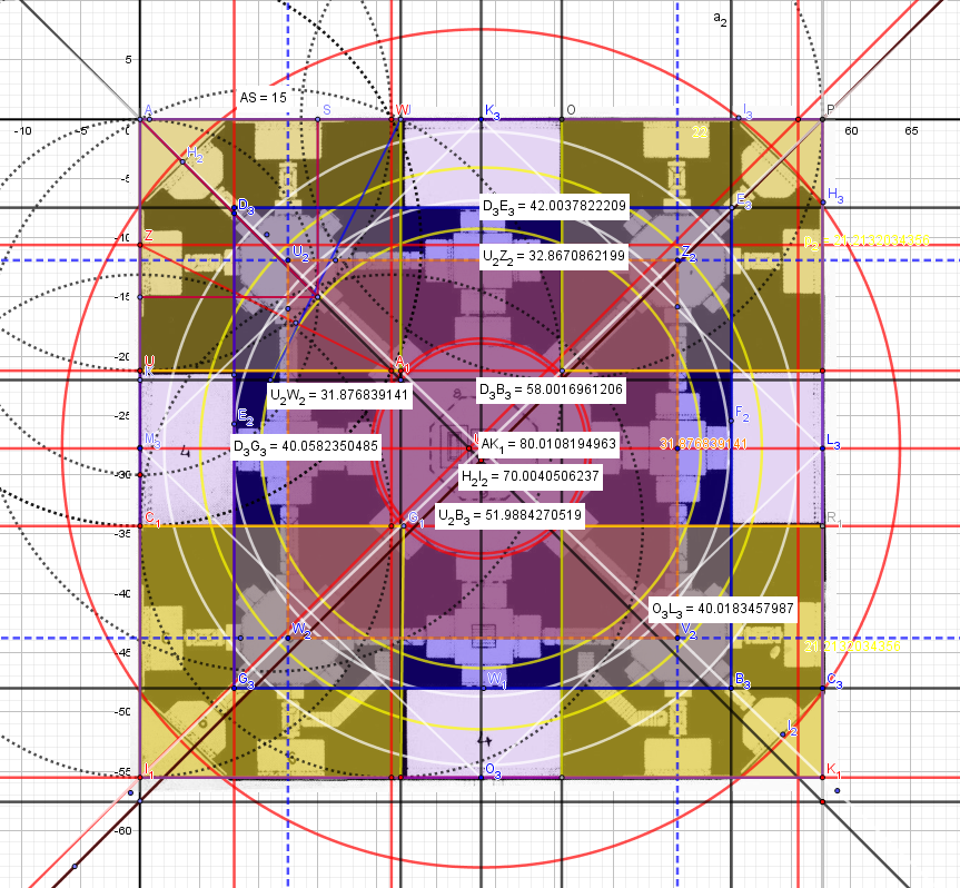 Rappelons nous de la chapelle blanche à Karnak, quatre carrés mais cette fois ci espacés de racine de 2 moins 1 !