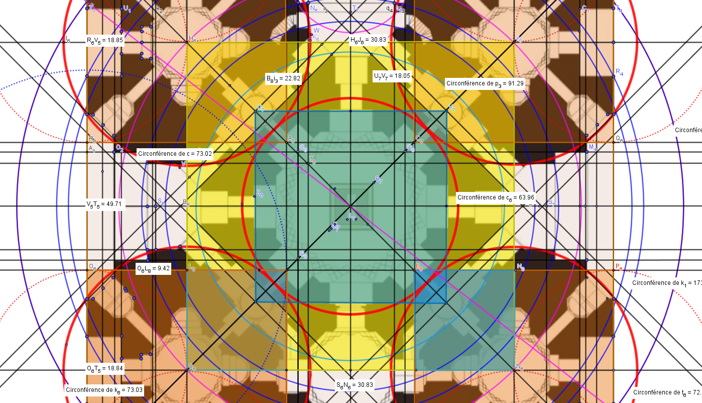 Quand au carré jaune dont les coins passent en dessous de nos quatre carrés, nous pourrions le superposer à l'identique avec la largeur du stylobate du Parthénon !