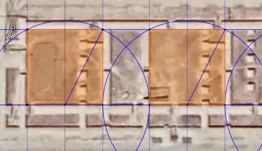 Nous avons glissé sous notre tracé modulaire la vue aérienne, et correspondent les centres des colonnes avec les carrés de 6.2832 mètres de côtés, soit 12 meh nessou.
