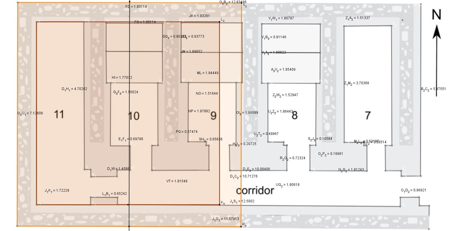 Suivons le périmètre du carré intérieur, un des côtés passe au milieu de la porte de la pièce centrale, marquée 9.