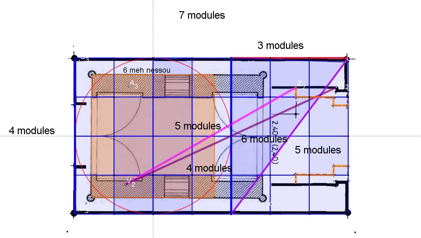 Nous avons tracé le cercle de même périmétrie que le carré module et tracé le carré sur la droite en bleu de même surface que le cercle inscrit dans le module.