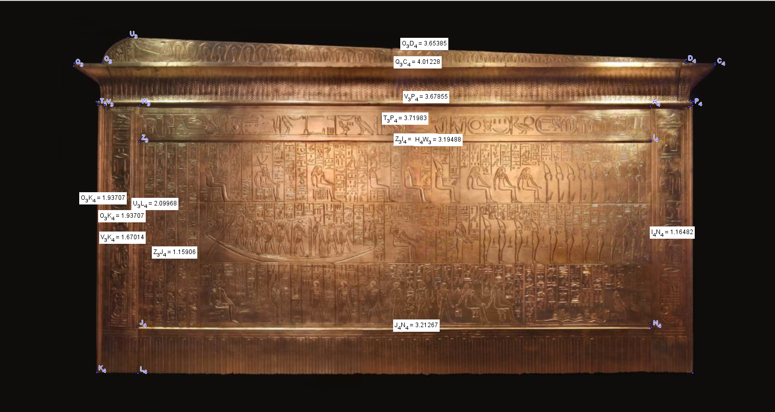J'ai vérifié et revérifié, si la photo respecte les proportions, avec un 2.74 m/1.47m ( seule mesure donnée par Carter) de prise au sol de la cinquième enveloppe, la première en mesure maximum a donc bien un 6.009m sur la photo et 6.03 m en calculant directement sur les dessin de Carter.
