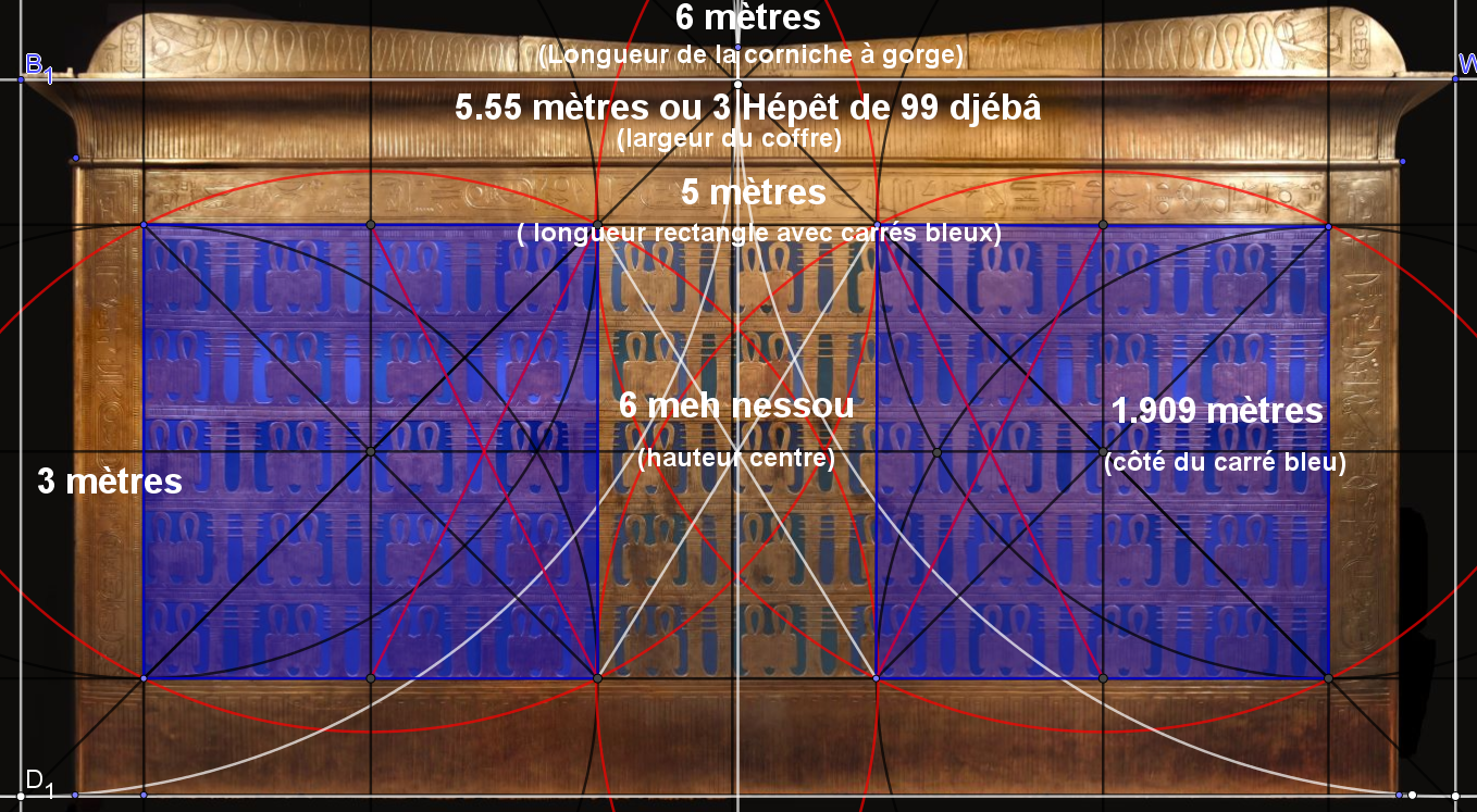 Mais nous avons aussi avec 5.55 mètres, largeur du coffre en bas, 3 fois(3 meh nessou 3 shesep et 3 djébâ), 3 fois 99 djébâ qui a permis la triangulation rationnelle du carré pour obtenir, bien mieux qu'avec une équerre, les angles droit pour la menuiserie...
