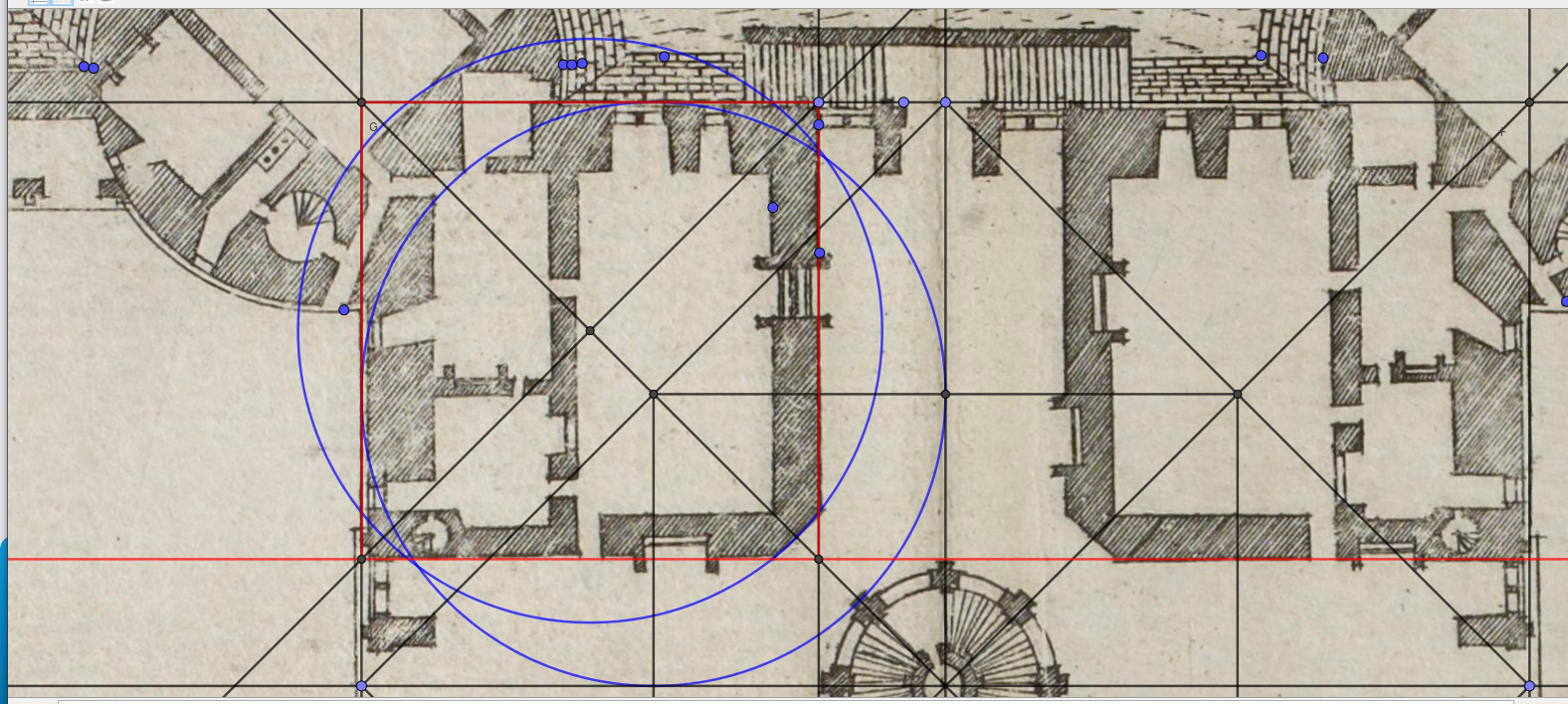 Et Léonard d'y inscrire quatre cercles, ici de couleur bleu, matrices des tours, mais aussi des carrés des pièces intérieures comme nous le verrons par la suite.