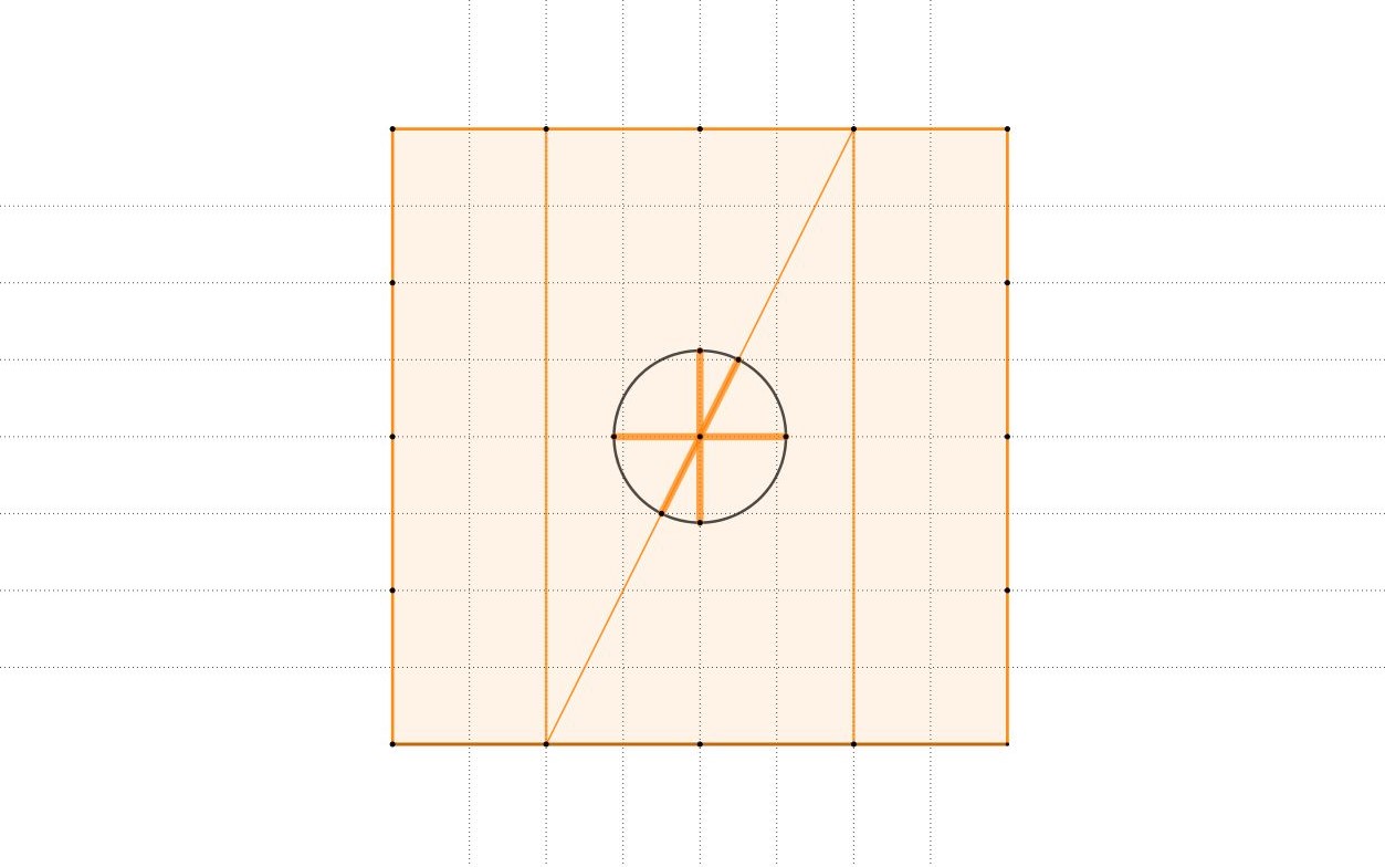 En proportion, en pointant quatre carrés au centre, nous avons divisé notre diagonale en quatre parties égales.