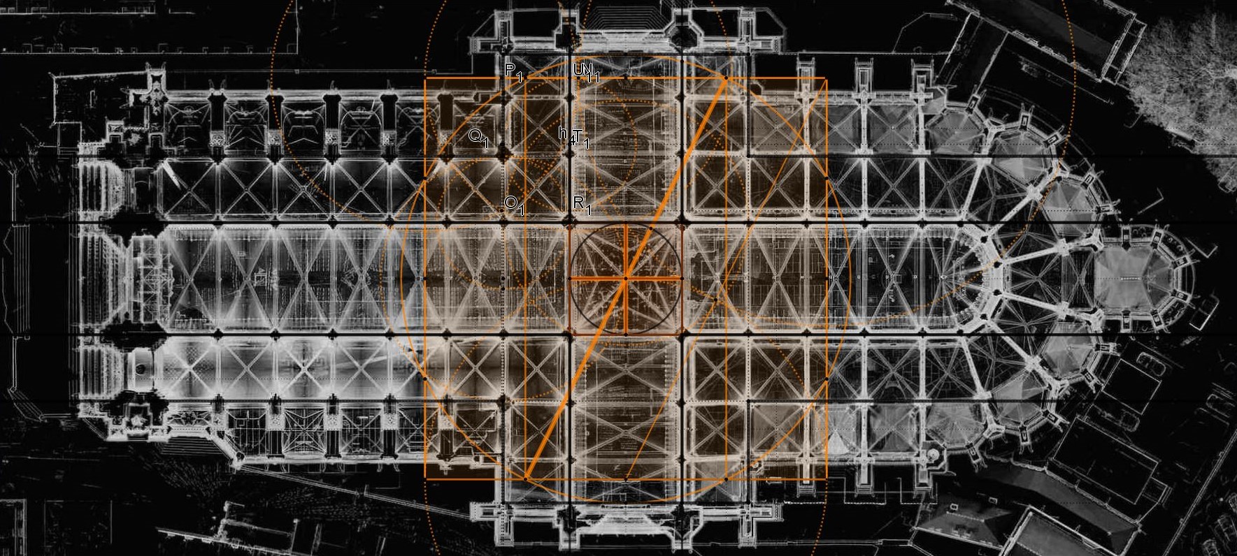Quand au transept il est donné à 58, 55 mètres de longueur, nous avons tracé 58.54 mètres.
