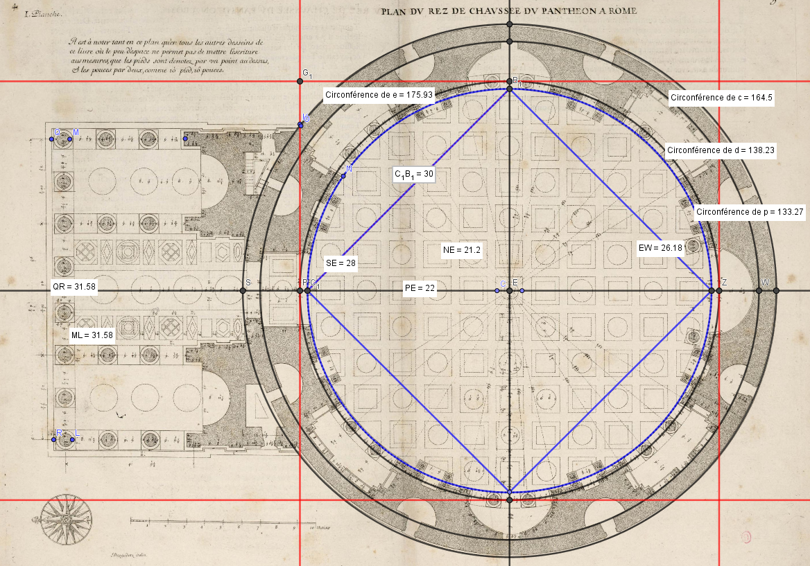 NB Sur le plan par rapport au paramétrage à 44.08 m pour le dôme, j'ai un 31.6 m et si la vraie valeur du dôme était plus 44 m que 44.08 m, il y en a 9 différentes, on tomberait sur 31.54 à plus ou moins 10 centimètres, on ne peut pas mieux avec un dessin...et qu'elle était la valeur du pied du roi pour Desgodetz, car cela se disputait encore à l'époque...
