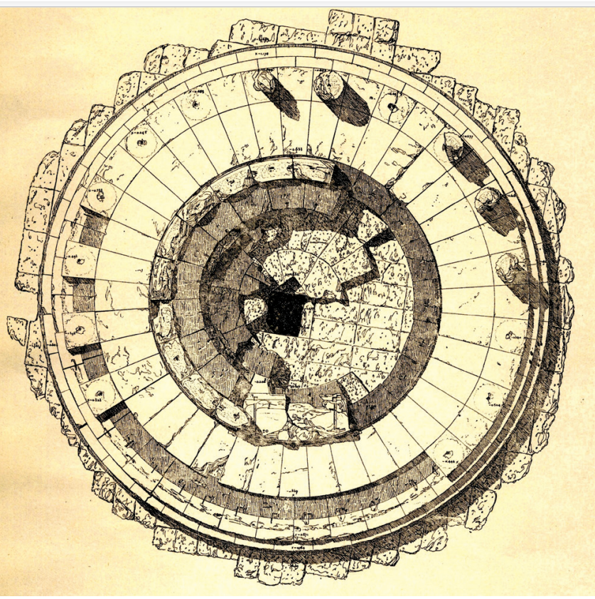 Ce carré de quatre meh surface est en quadrature périmétrique avec la troisième marche, cercle de 6.66 mètres de rayon, socle qui reçoit les 20 colonnes !
