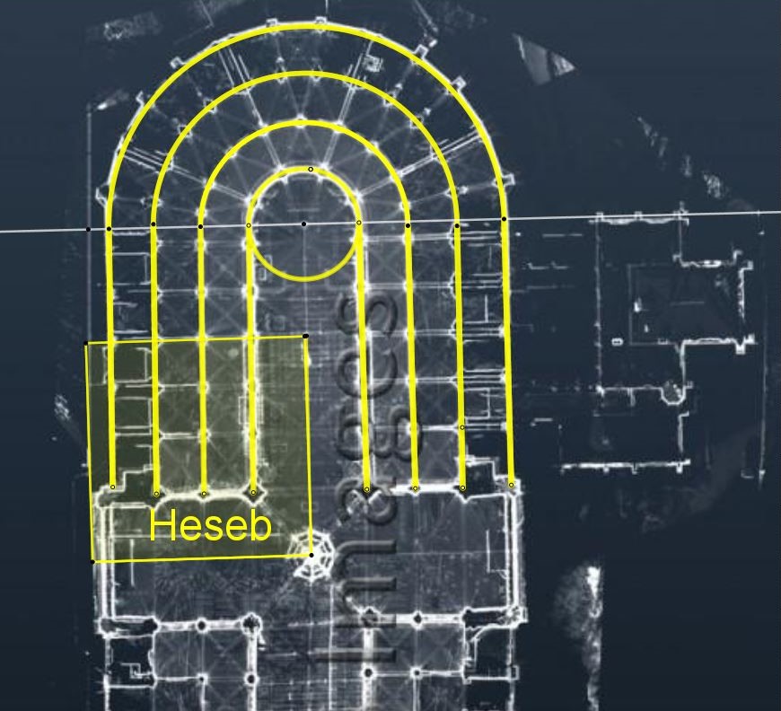 Les quatre carrés Meh Egyptiens ont même périmétrie que le cercle de l'hémicycle du chœur de Notre Dame de Paris, ici en rouge, rayon donné par Andrew Tallon par le laser 3 D