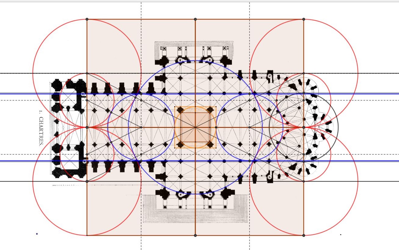 Quatre carrés Setjat de 52.36 mètres de côté, 100 meh nessou, distance de part et d'autre du centre de la croisée du transept, à l'ouest au bout de la nef au commencement des tours jusqu' à l'Est au centre des hémicycles des grandes chapelles Nord et Sud.