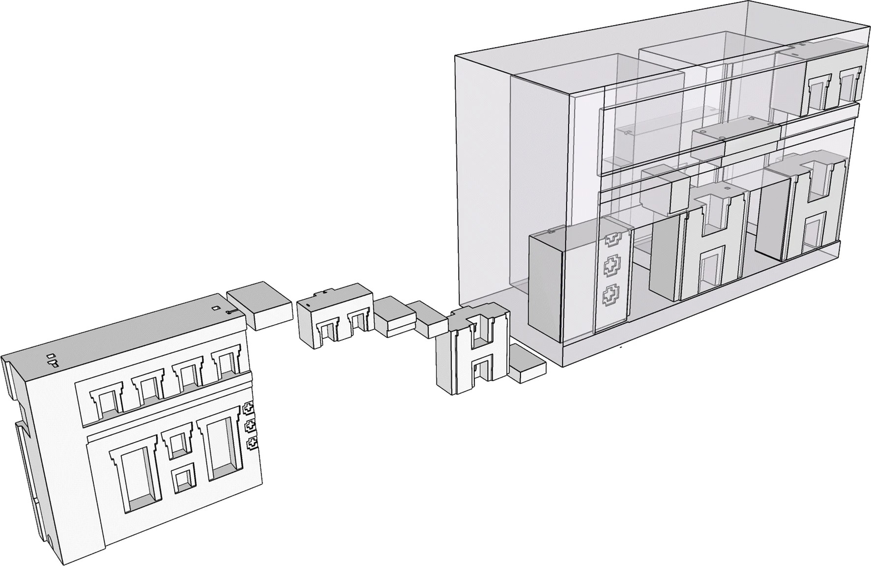 Il reste toujours que les blocs H sont intégrés au monolithe ainsi que les formes qui les entourent, niches et ouvertures, ou que les blocs H sont isolés ainsi que les formes qui les entourent et réassemblés à l'image du monolithe.