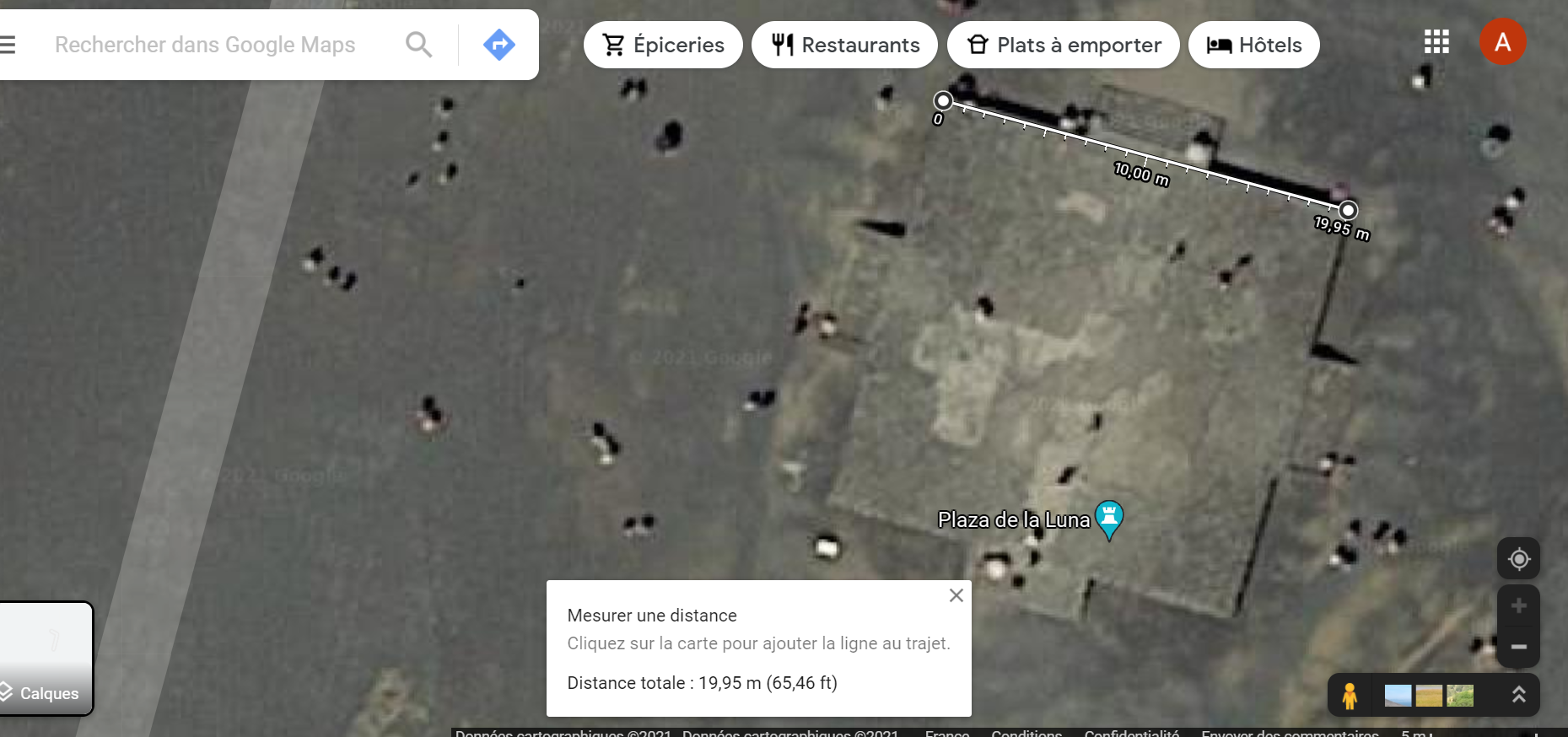 Pour patienter afin d'obtenir plus de précision pour les mesures de la Pyramide de la Lune, il est plus simple de mesurer les structures qui apparaissent plus nettes et bien détourées à proximité de cette pyramide..