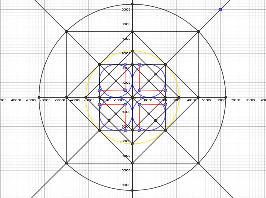 Le cercle des tours apparaît ici comme cercle de même surface que les carrés restants, engendrés par les deux tables double carrés posées en croix.( Traits bleus)