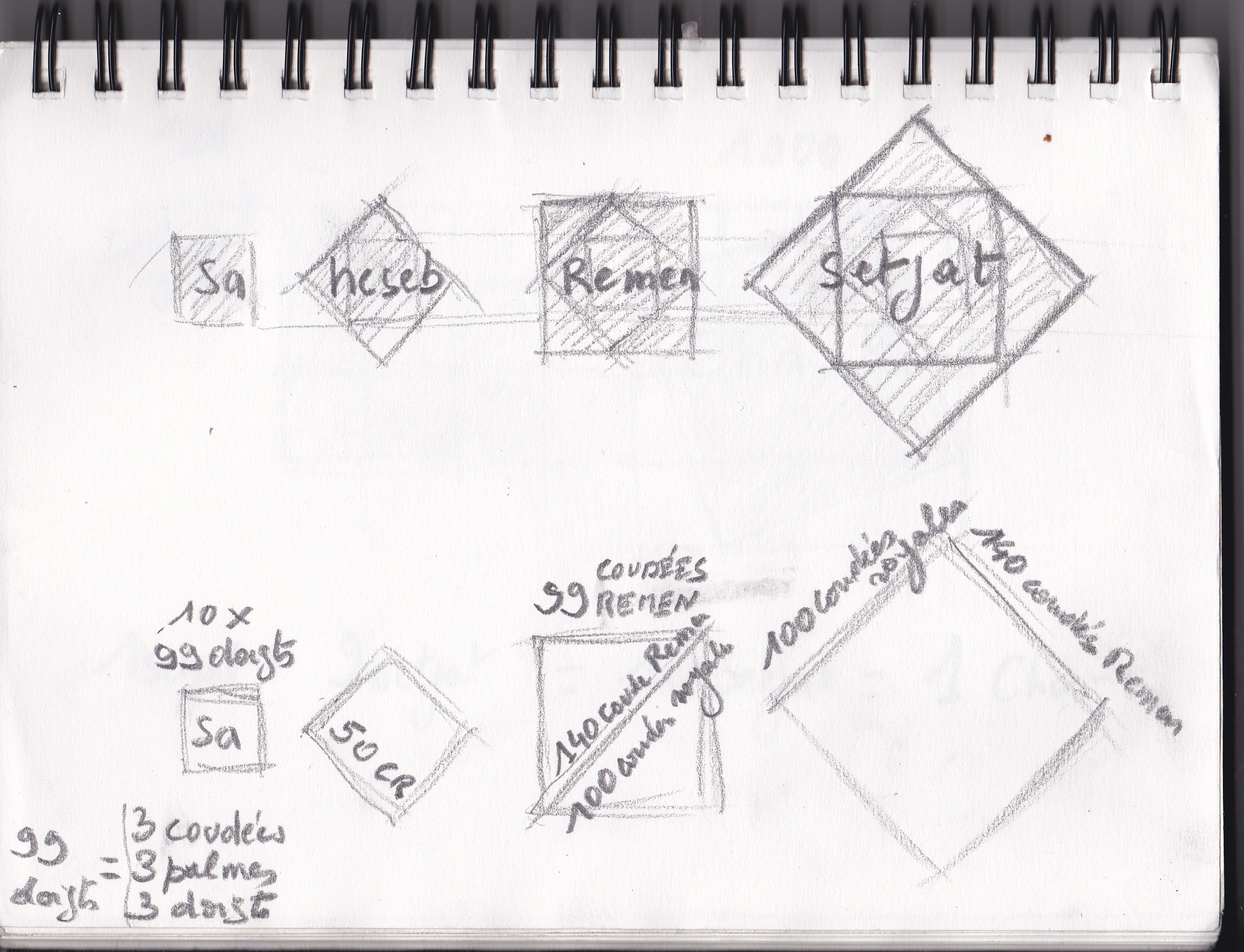 Sa diagonale est très exactement de 99 shesep (palmes) et de 396 djebâ ( doigts) , ce qui correspond à 12 meh nessou plus 12 shesep plus 12 djebâ ou encore 14 meh nessou plus 1 shesep.