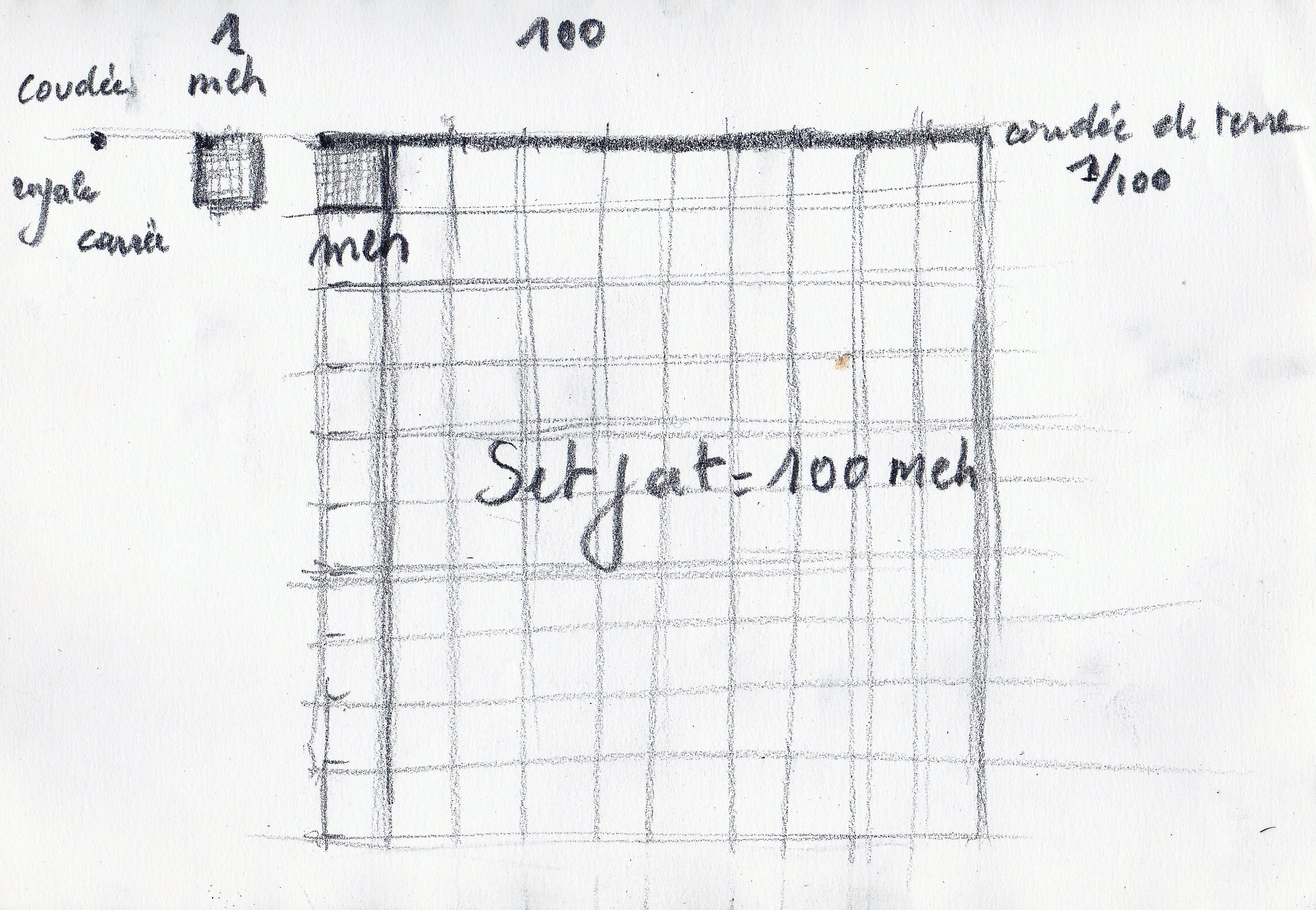 Le meh vaut donc 1 de surface, il est donc facile de passer à une surface valant 100 meh avec le meh sous forme de coudée de terre en rectangle d’une meh nessou sur 100 meh nessou, il suffirait alors d’en mettre 100 !