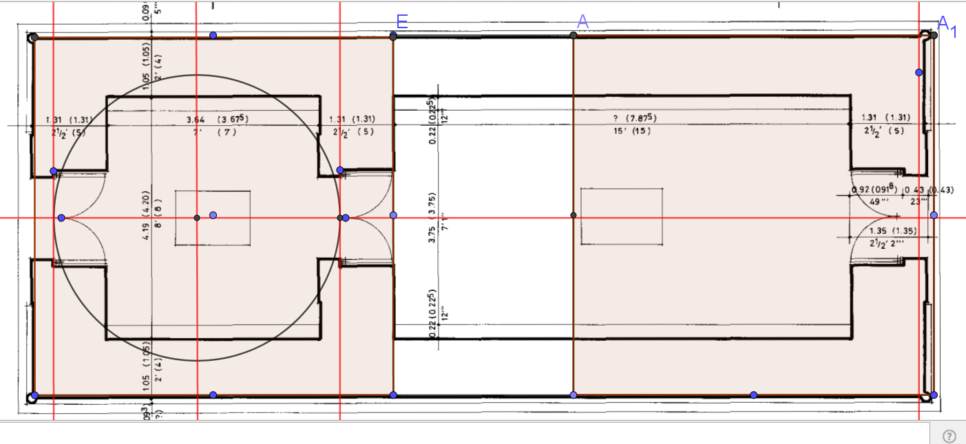 D'autre part la quadrature de la chambre gauche indiquée par la hauteur de la seconde porte (bravo de l'avoir débusquée, c'est magnifique) ne semble pas dépendre de la longueur totale de notre petite chapelle rouge.