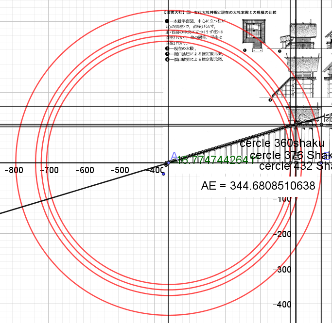 Nous allons pouvoir commencer par le commencement, car c'est avec ce cercle de 1000 Shaku que commence le premier geste de cette élévation première qu'est le temple d'Izumo, dont le rayon solaire détermine l'élévation de la plateforme auquel s'ajoute la hauteur du temple jusqu'au faîte du toit.