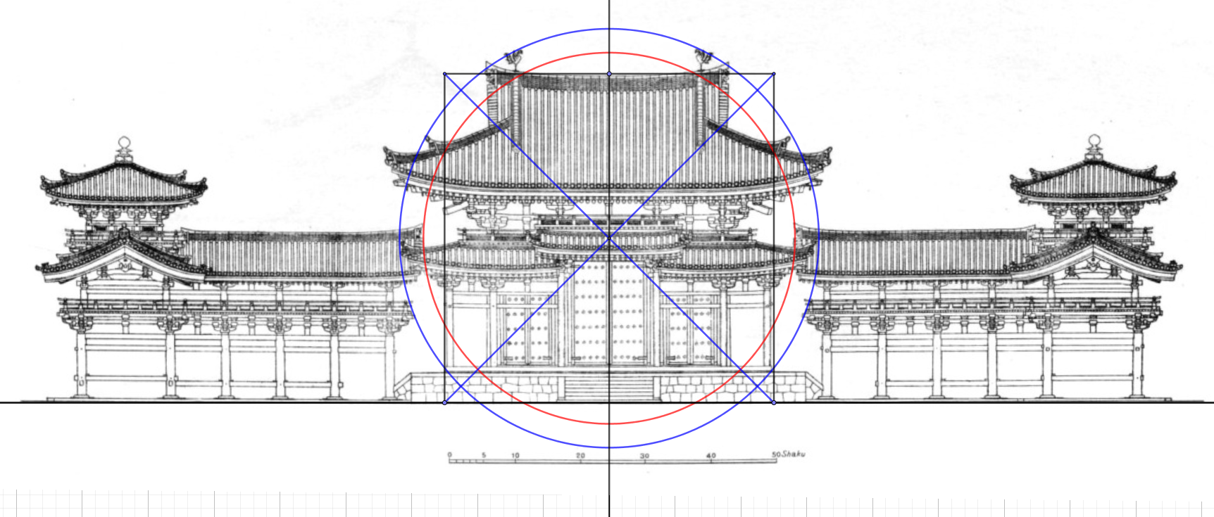 l'espace totale avec le socle, 168.67 Shaku est la largeur totale et 132.527 Shaku la longueur, leur rapport est de 1.2727217 qui peut ĂŞtre un 4/pi ou un racine de Phi !