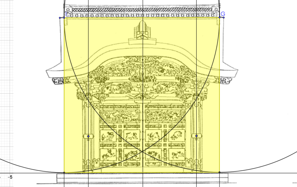 Prenons du recul, nous voyons bien un autre carré formé par les axes des deux piliers, ne seraient-il pas les 6/5 de la largeur!