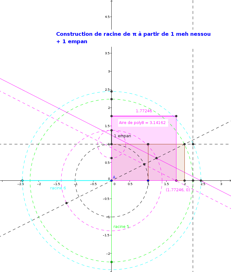 Le cercle qui a la même surface que notre rectangle, ou carré de côté racine de 2 fois racine de Pi mètres, a pour rayon notre déesse quartzite passée à la moulinette de la racine de 2 !