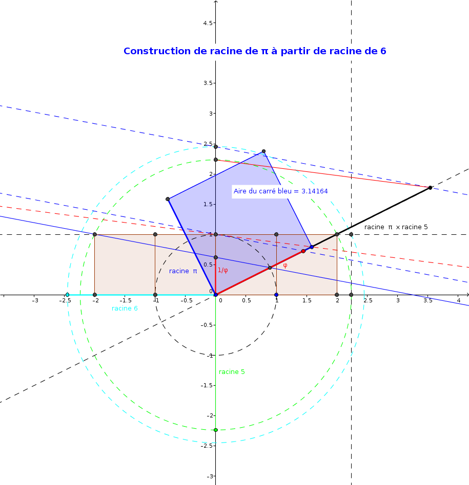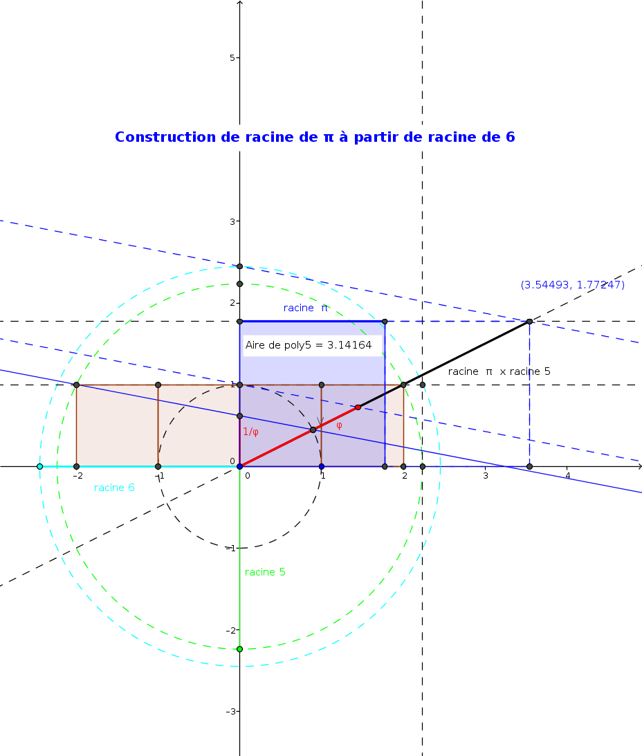 Le cercle qui a la même surface que notre rectangle, ou carré de côté racine de 2 fois racine de Pi mètres, a pour rayon notre déesse quartzite passée à la moulinette de la racine de 2 !