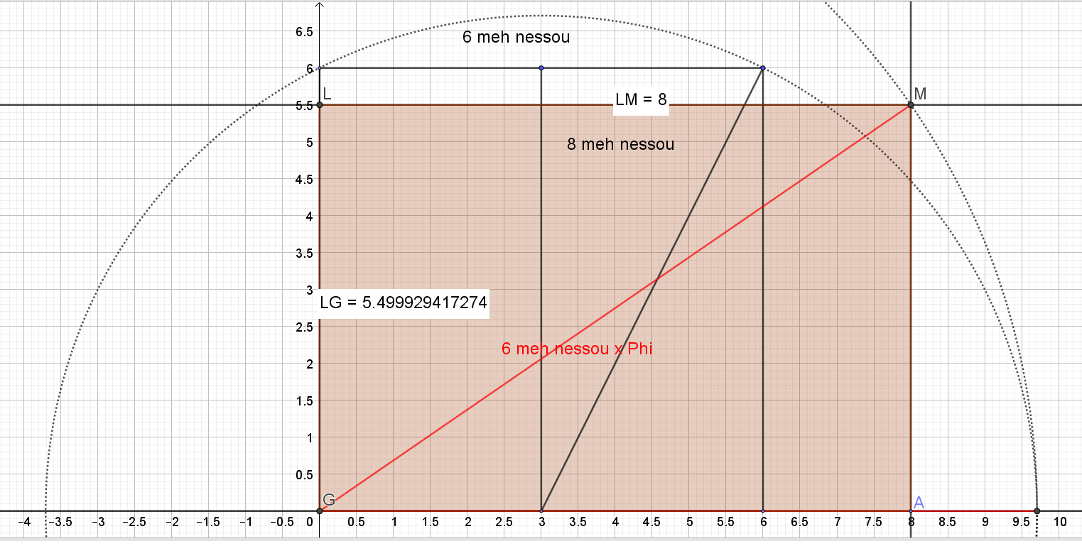 Par Isis, nous pouvons tracer un rapport 1 et Phi carré qui nous donne instantanément 5 meh nessou et donc 6 et 8 par Thalès !