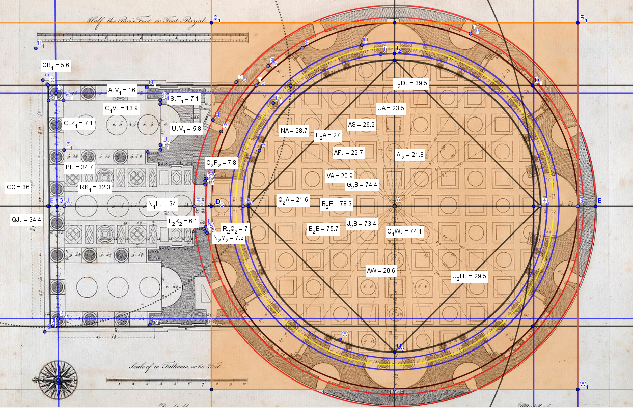 Le rayon nous a surpris puisqu'on est à 29.59 mètres, soit 100 pieds romain de rayon, s'harmonise avec le carré intérieur lui aussi de 100 pieds romain de côté.