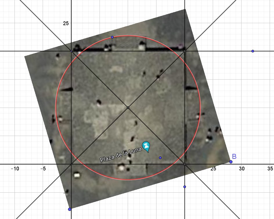 Sur la première image le cercle bleu et le carré bleu ont même surface, carré dont le côté est la distance de la plateforme de la place de la lune jusqu'à celle de la place de Quetzalcoatl, et le diamètre du cercle bleu la distance de la pyramide de la lune jusqu'à celle de Quetzalcoatl