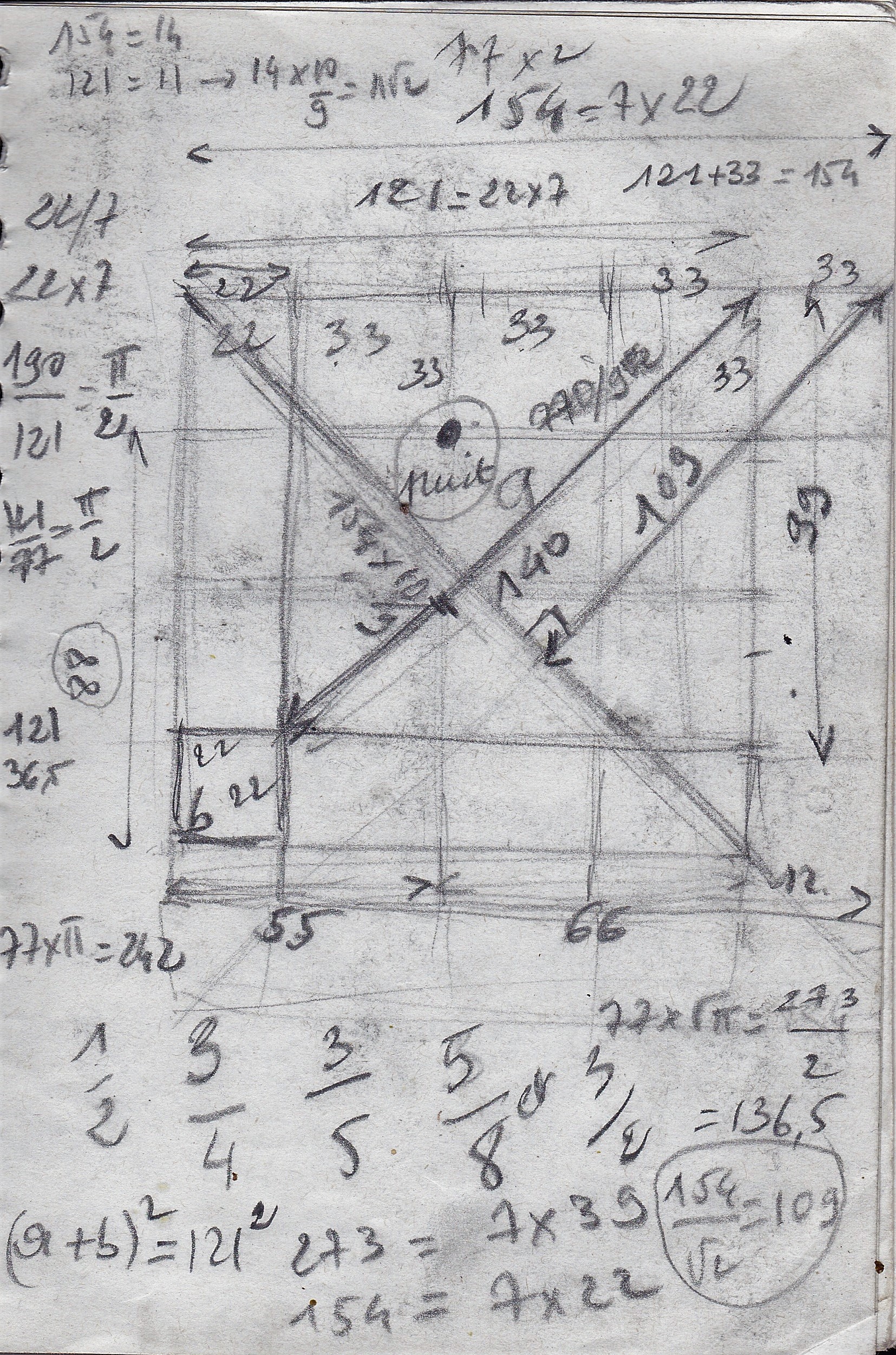 Tout comme un cercle de 77 mètres de diamètre a une circonférence de 77+66+55+44= 242 mètres et 242/2, c'est 121, le grand côté en mètre de la pyramide de Djeser de notre bon Imhotep!