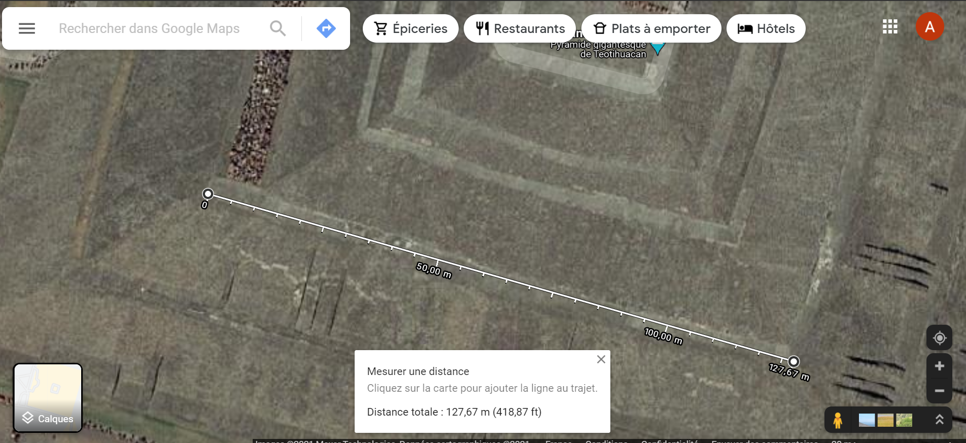 Prenons maintenant la distance entre la plateforme de 20x20 m sur la place de la lune et celle d'aussi 20x20 m sur la place de Quetzalcoatl.