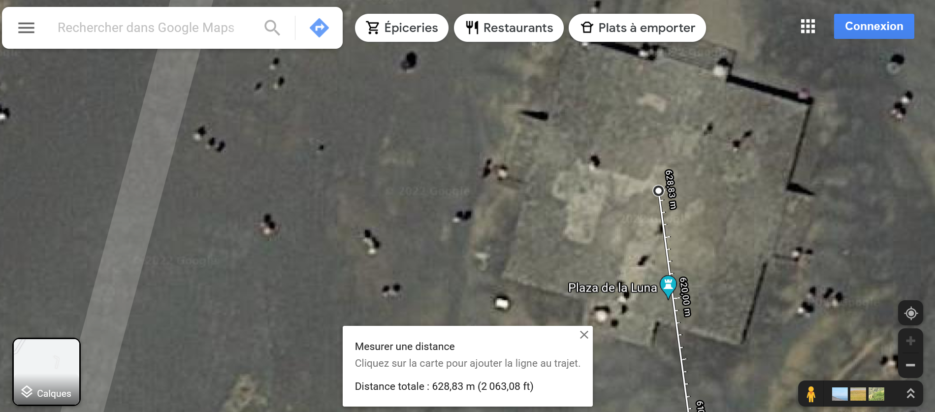 628 mètres, c'est bien deux fois la diagonale de la base de la pyramide du soleil, soit 1200 meh nessou Égyptiennes du centre de la pyramide du soleil jusqu'au centre de la plateforme de la place de la lune, comme nous avions 1200 mètres du centre de la pyramide du soleil jusqu'au centre de la plateforme de la place de Quetzalcóatl.