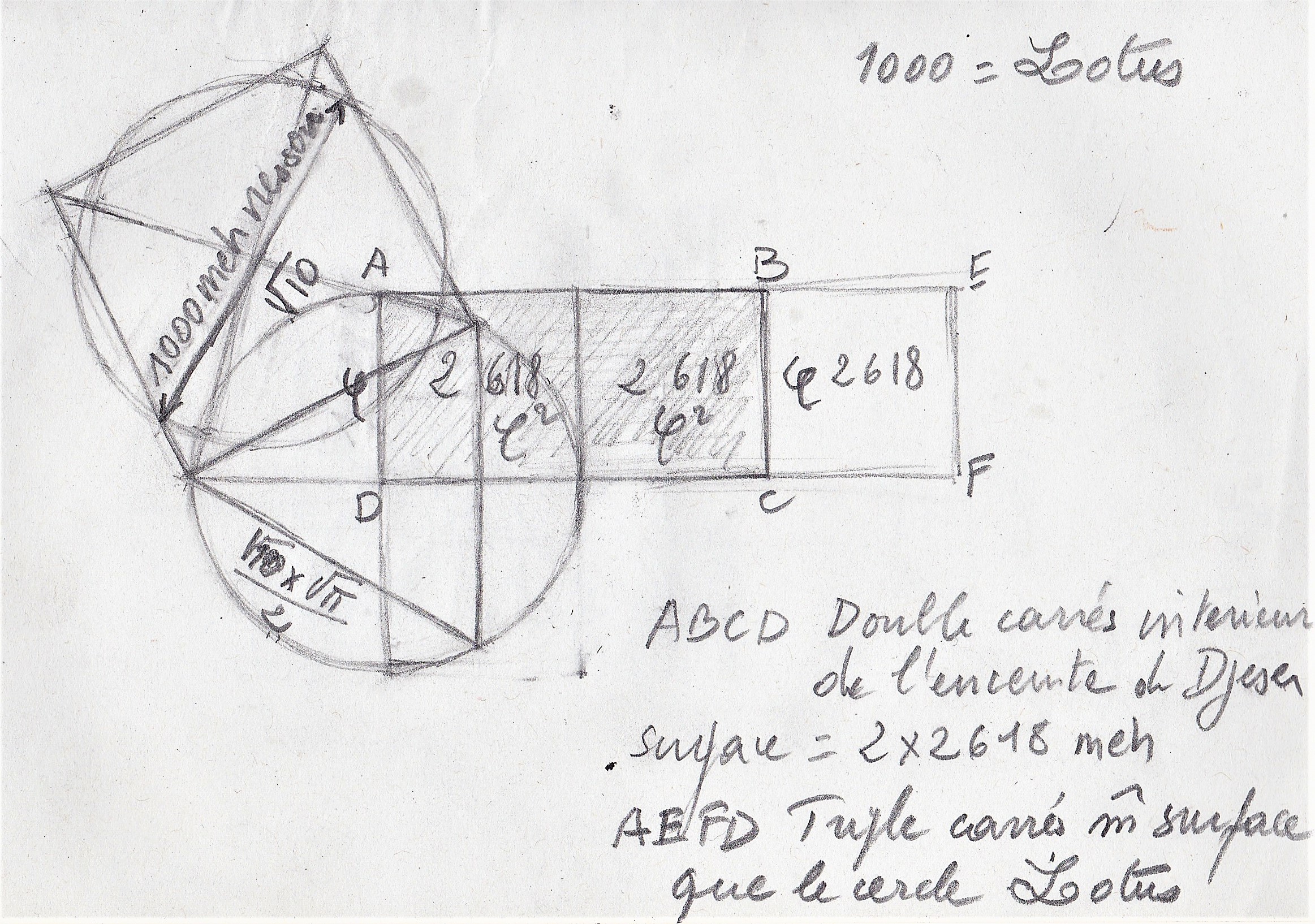 En effet le double carré intérieur de l'enceinte de Djeser fait en surface 5236 meh...deux carrés de 2618 meh chacun.