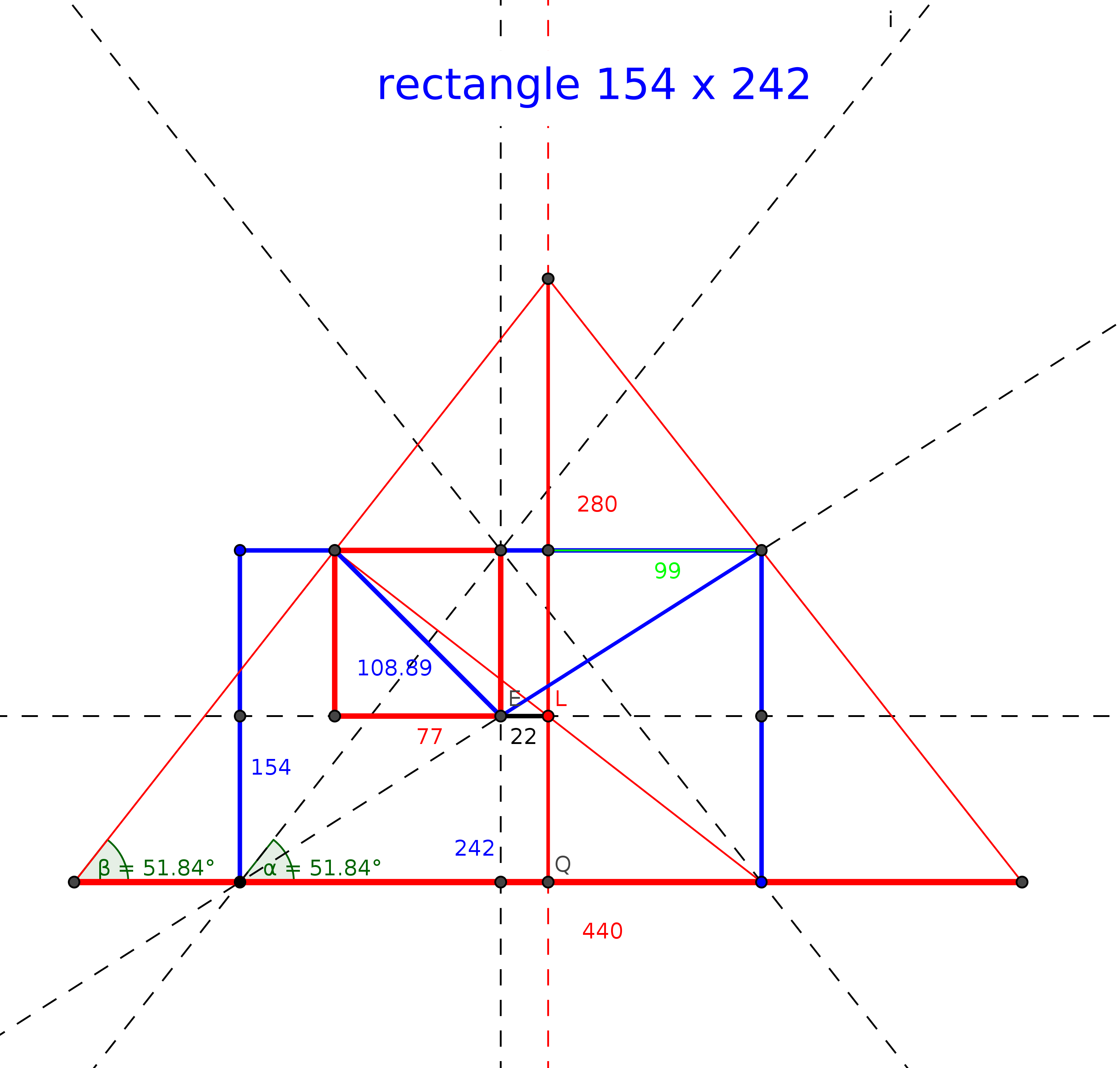 En traçant les diagonales des rectangles 154 x 121, on constate la même pente que la pyramide de Khéops, ce qui est normal 11 x 14 et 11 x 11 se réduisant en 14 / 11.
