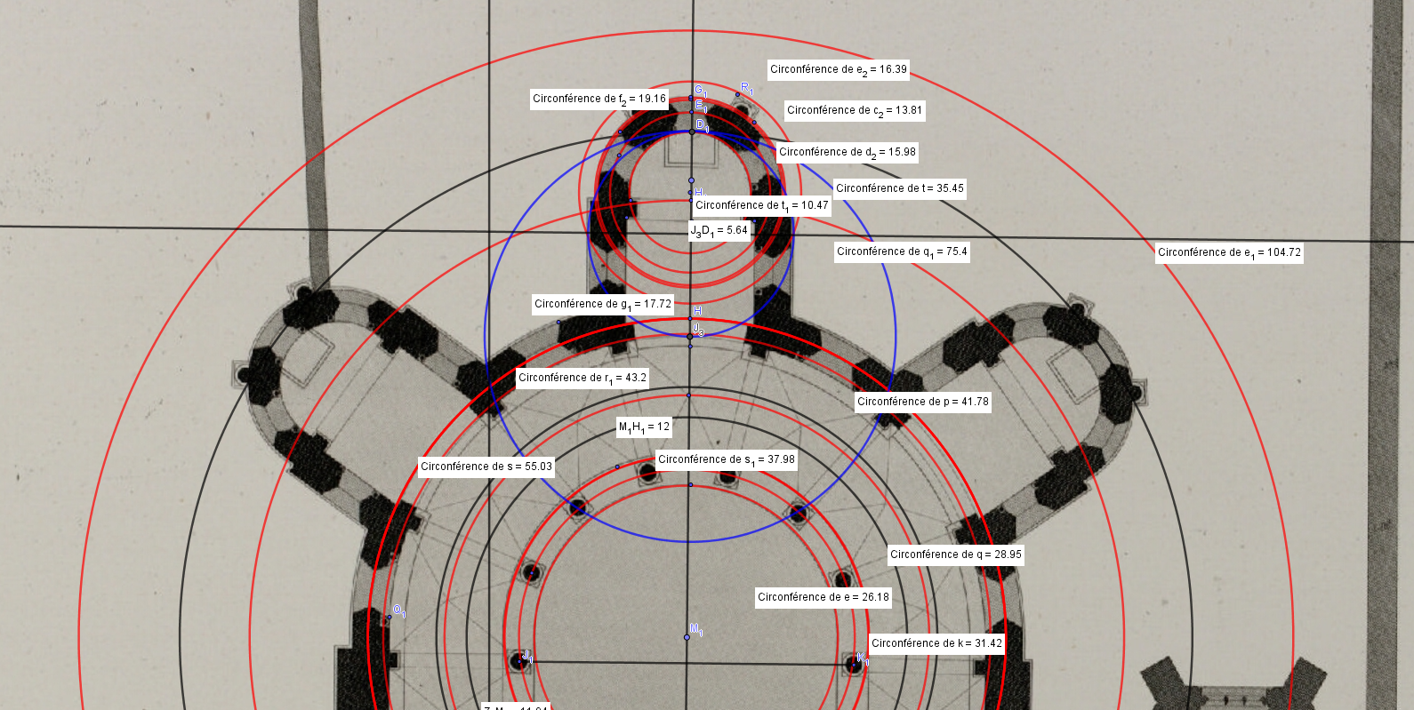 Je ne cite pas le cercle qui passent par les clefs de voutes du choeur, il ne fait pas partie du plan au sol, mais du plan au ciel !
