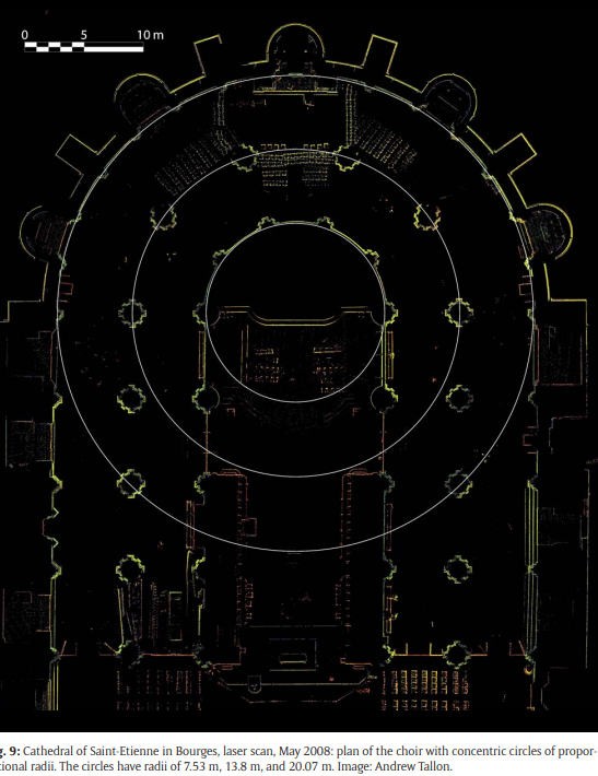 Il y joint deux images du plan de l'hémicycle du choeur avec les mesures de Notre Dame et de Saint Etienne de Bourges...enfin des mesures sur lesquelles nous pouvons nous appuyer.