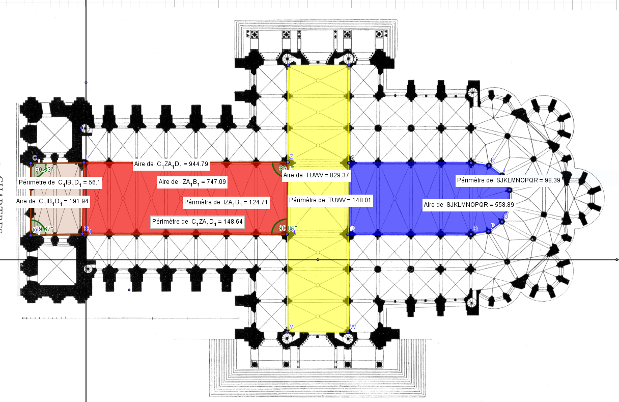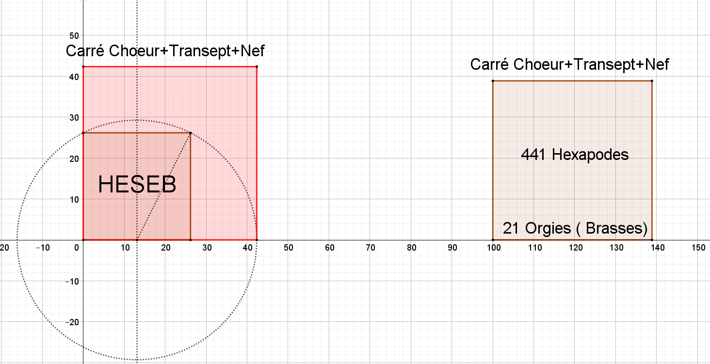 Et de sacrées surprises en cherchant le carré surface correspondant à la somme Nef-Transept-Choeur, mais aussi le cercle de même surface et de même périmétrie, mais encore le carré et le cercle de même surface et de même périmétrie de chaque partie de cette Trinité.