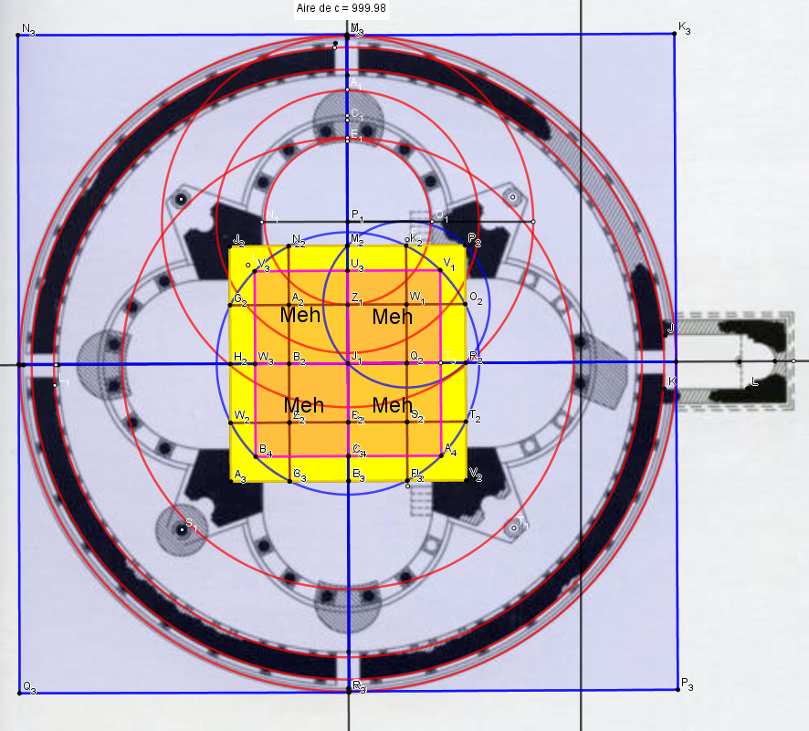 Ce cercle bleu s'inscrit dans un carré de quatre Meh de surface, c'est le transept qui d'ailleurs s'inscrit dans un cercle ici visualisé qui n'est autre que le socle de la Tholos de Delphes