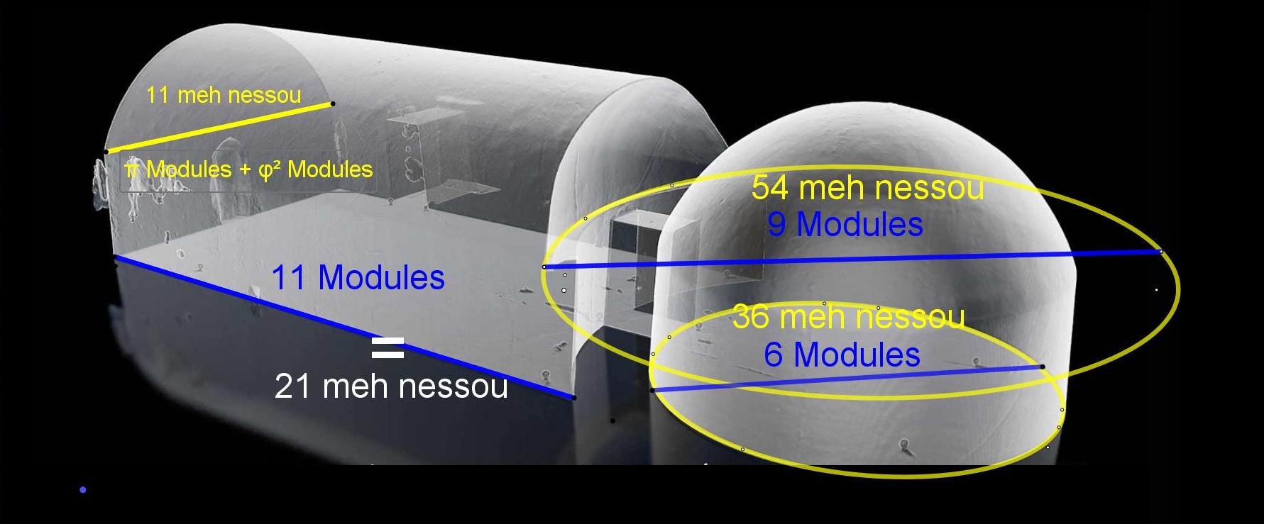 D'autant qu'ici avec les longueurs de module, 11 longueurs de module, le demi périmètre extérieur du rectangle de la chapelle, sont tout simplement 21 meh nessou et le périmètre entier 42 meh nessou pour 22 modules.