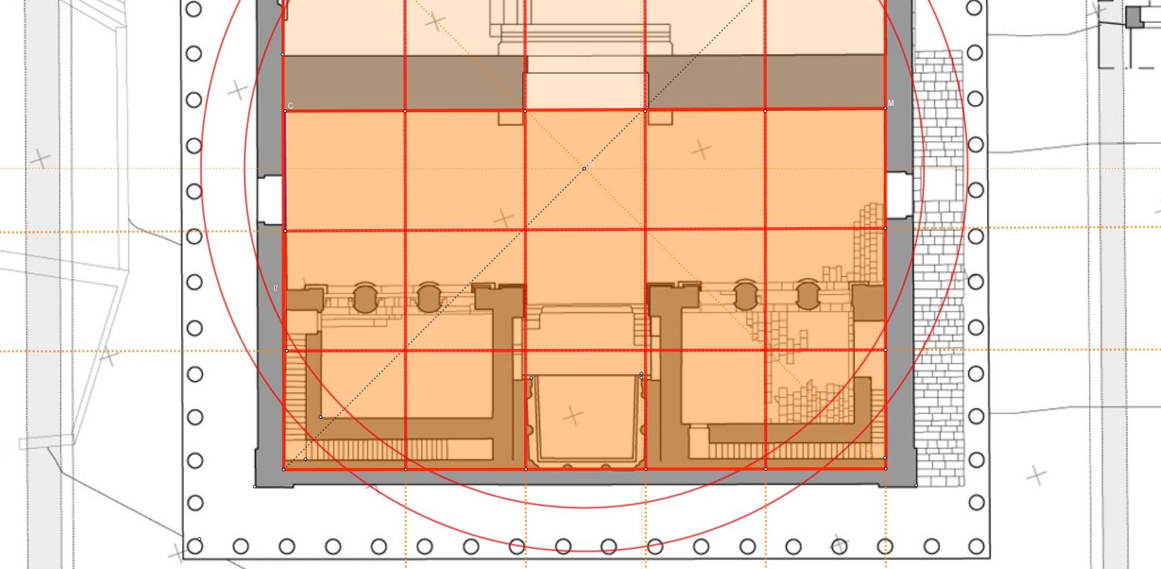 Toujours centré par les diagonales du carré que forment le contour externe des murs du temple, ici la ligne intérieure des colonnes tout autour du temple témoigne de la présence d'une surface Remen, autre mesure de surface Egyptienne.