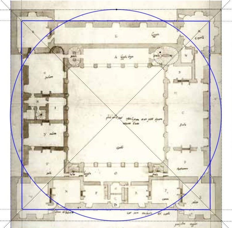 Il est le répondant d'un cercle invisible, ici le cercle bleu qui sera inscrit dans le grand carré que forme les quatre tours...
