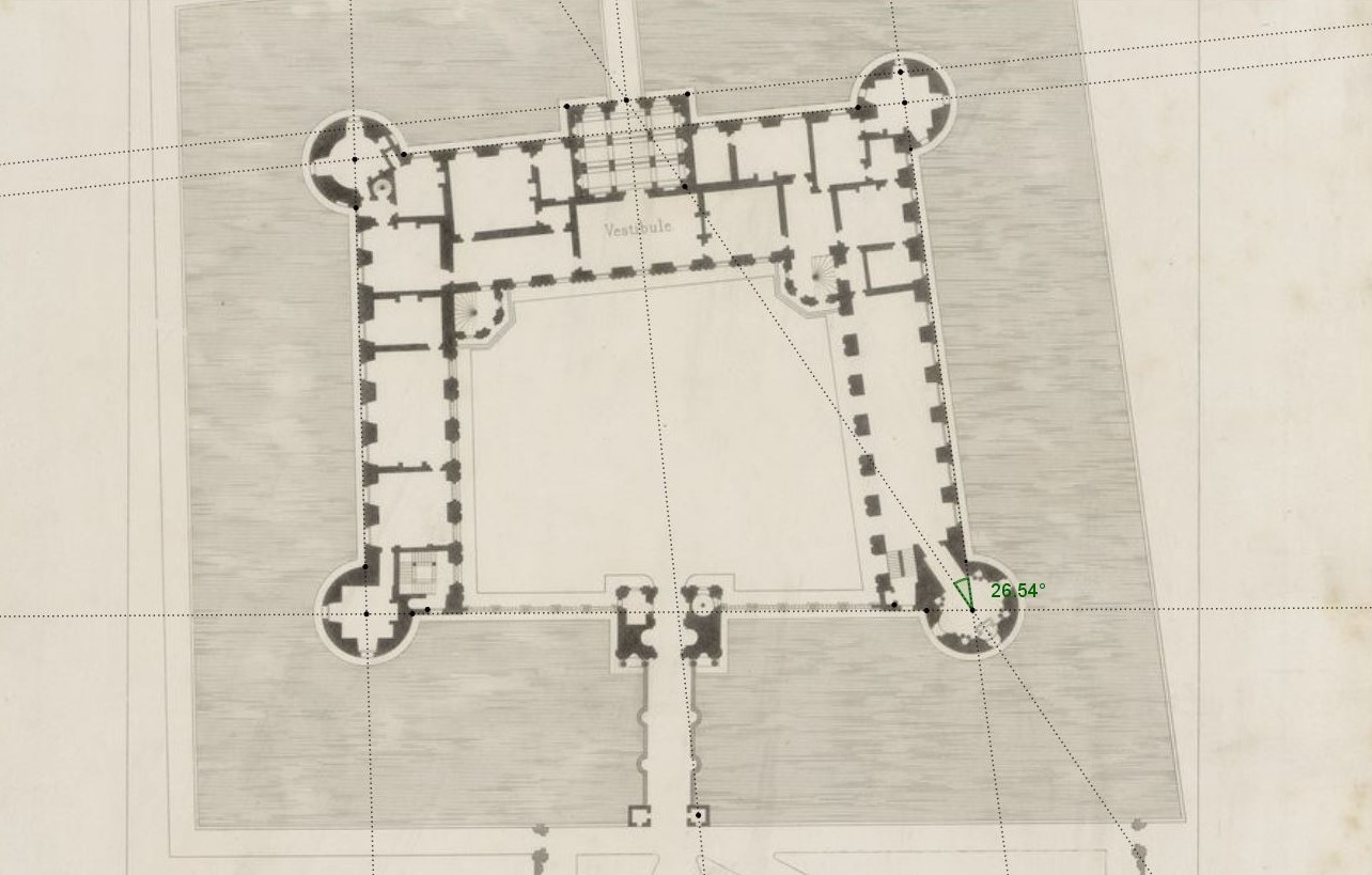 Dans le dessin de Sauvageot, la tour en bas à droite, qui est la tour de la chapelle, deux ouvertures sont dans l'alignement du mur externe, Nord-Est ( à droite) alors que sur le plan de Sagot la tour tourne l'axe de ses fenêtres de 26°5 vers l'Est....