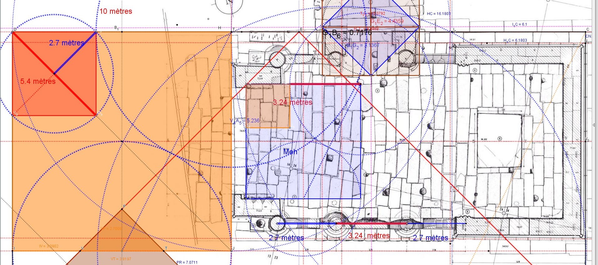 Sur le plan nous avons mesuré au réglé 11.44 mètres pour cette diagonale, soit divisé par Phi, donne bien 7.071 mètres, mesure du fond du naos, ici le segment rouge.