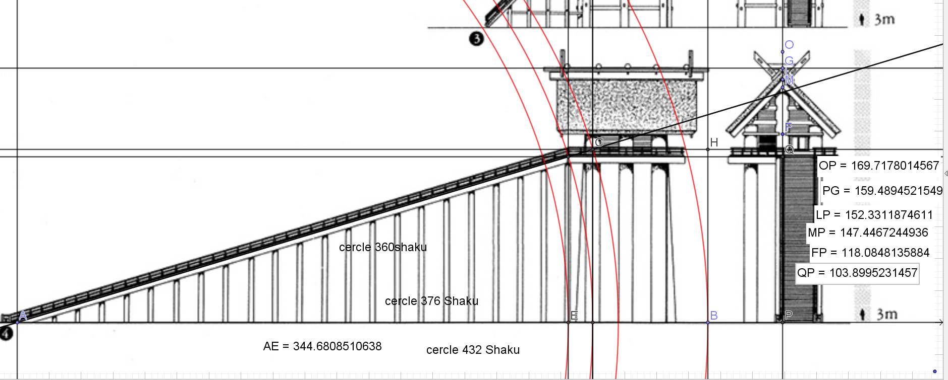 Si la diagonale de la plateforme est la hauteur de là pente, 99 Shaku, nous n'aurons plus un angle de 16.7 comme le donnent tous les dessins sur Izumo, on descendra même en dessous de 16 Degrés