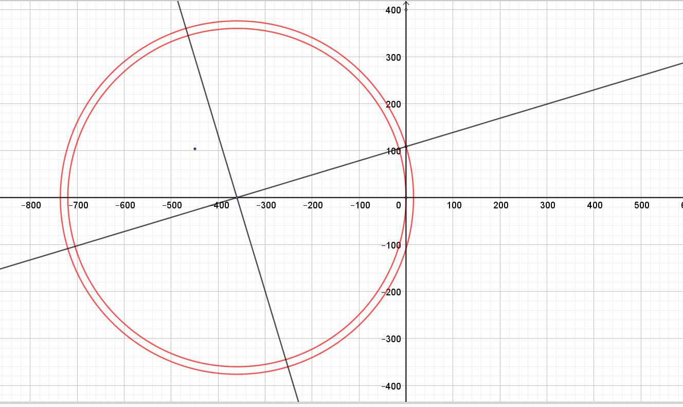 Traçons un cercle de 376 Shaku et une base de 360 Shaku sur l'horizontale des axes en partant du centre du cercle, l'axe vertical va croiser l'arc du cercle pour dessiner ce triangle de 376 d'hypoténuse et de 360 de côté adjacent...
