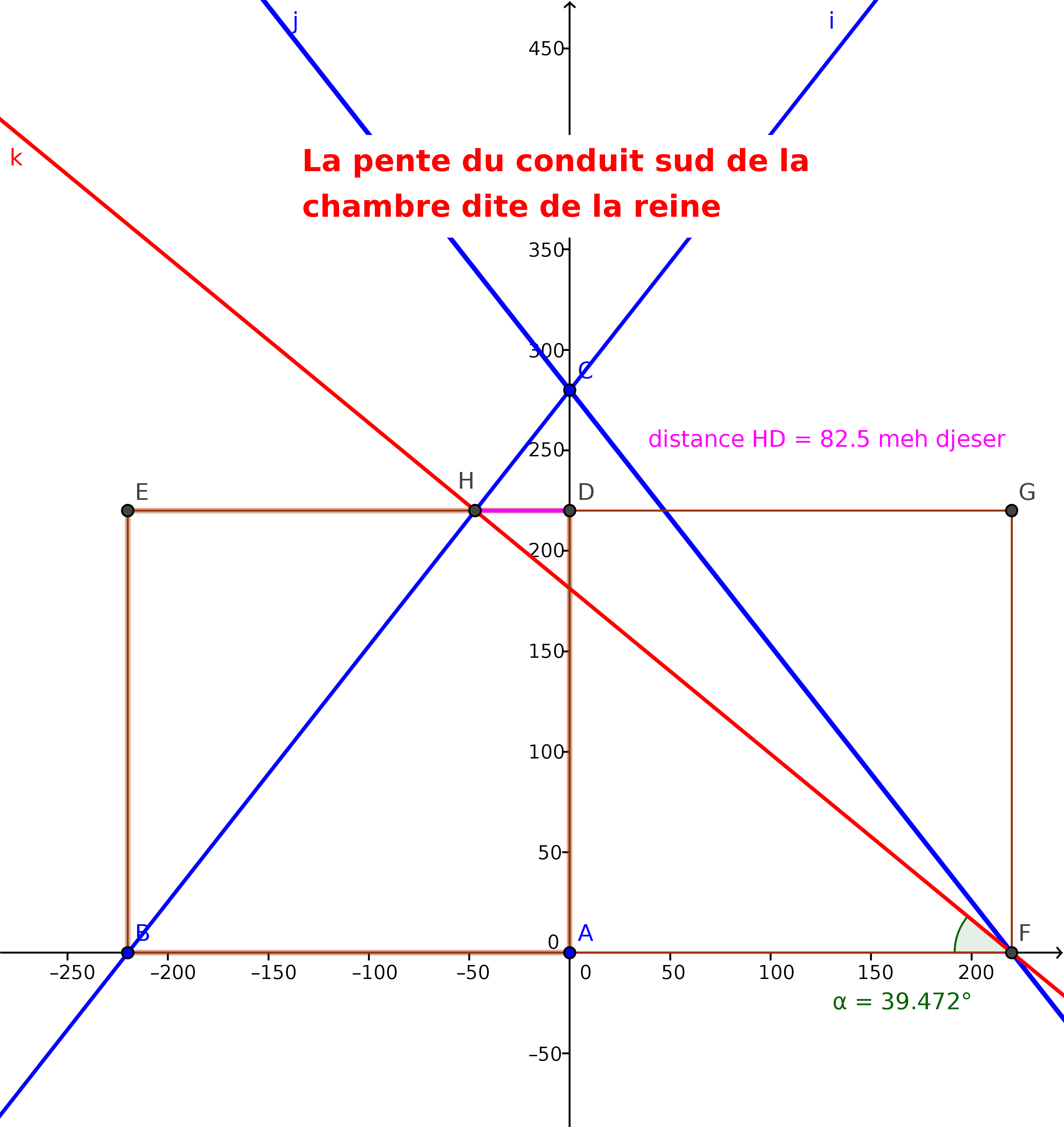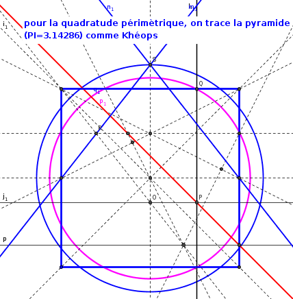 Cette pente indique non seulement le point de quadrature surfacique mais aussi attire l'attention sur l'intersection du carré de 220 de cÎté et la pente de la pyramide.